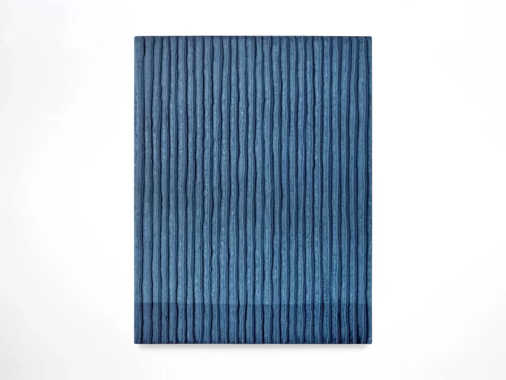 Maya Makino (b. 1980, Kanagawa, Japan) is a painter whose entire practice revolves around a single material conversation: indigo dye absorbed into wood panels that have been prepared with gofun, the traditional shell-lime gesso. Living and working near Tokyo, she relies on the subtle translucency and capillary pull of the dye to build depths of blue that feel less applied than revealed, as if the colour has surfaced from the grain itself. Makino treats painting as a way to hold fleeting perceptions—night air, distant rain, the fragrance of a flower—before they crystallise into words. Each work begins with an involuntary flash of memory that she quickly sketches, then re-creates through successive soakings of the panel. Indigo seeps beyond the top layer, registering every fibre, crease, and relief she has coaxed into the ground. Because the pigment is plant-based and unpredictable, no two works share exactly the same hue; Makino describes this as “finding unexpected colour inside the colour.”