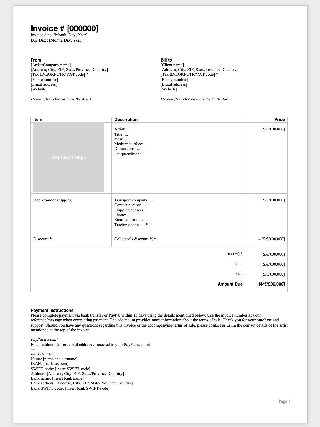 In the middle of the invoice, we have arguably the most important part of the document: the invoice table listing the artwork(s) they are purchasing. Make sure to include a thumbnail image of your artwork to avoid any confusion and mention the complete metadata of the artwork in the description, encompassing the artist’s name, the title, the year, the medium/surface, the dimensions, and if the artwork is unique or part of an edition. Possible additional items include more artwork, door-to-door shipping, or a discount. Enter the prices of all individual items in the final column.