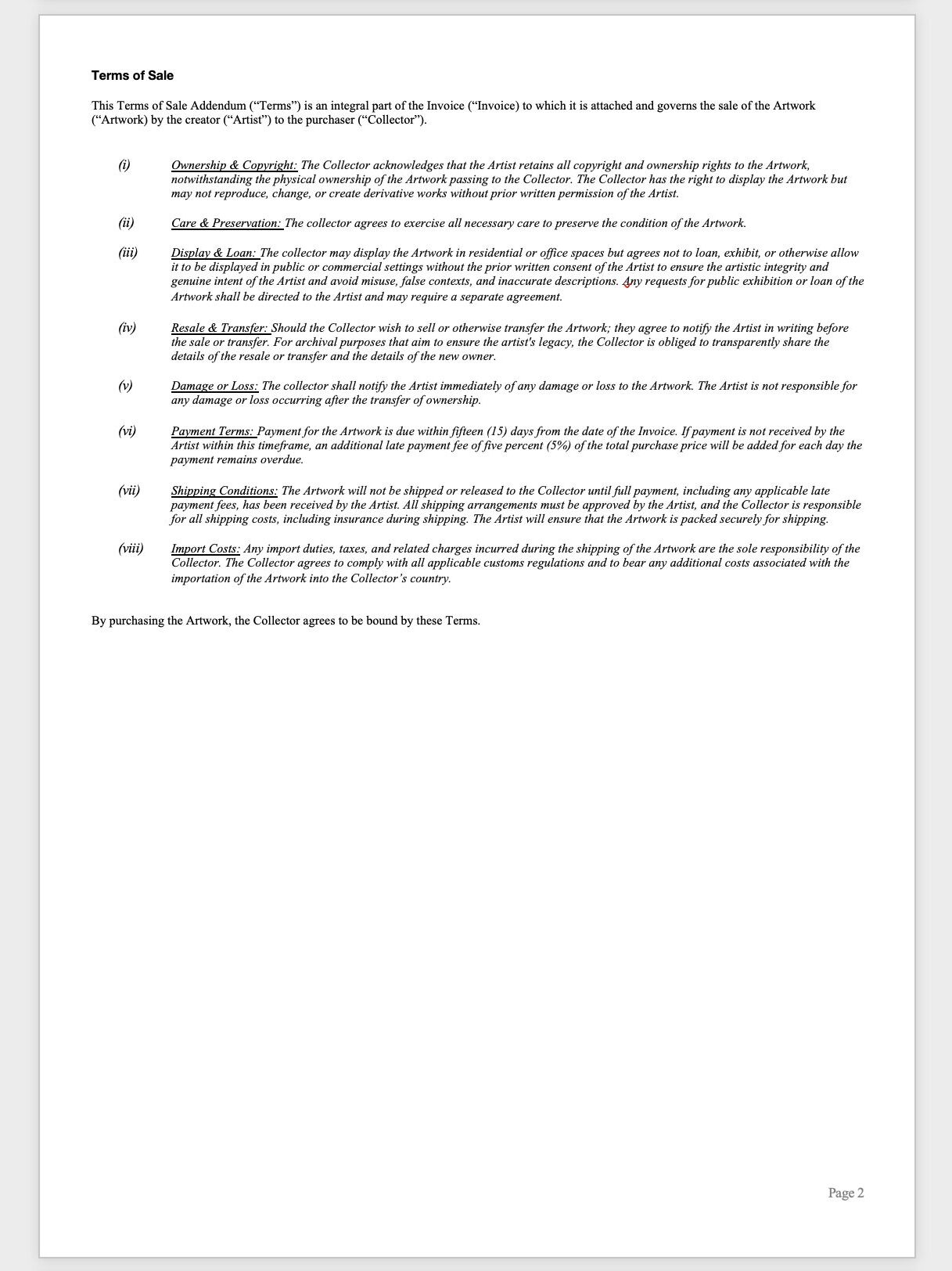 We conclude our invoice template with an addendum: the terms of sale. A Terms of Sale document outlines the conditions under which a sale is conducted between two parties: the artist and the collector. It is a crucial component in providing a legal framework that governs the sale of art, designed to ensure clarity and agreement on various aspects of the transaction, protecting the rights and obligations of both parties involved. For instance, in the general terms of sale that we advise to use in the CAI Invoice Template, we discuss the ownership & copyright of the artwork, the care & preservation, the display & loans of the work, the conditions for resale and transfers, damage or loss, the payment terms, the shipping conditions, and to conclude the import costs.