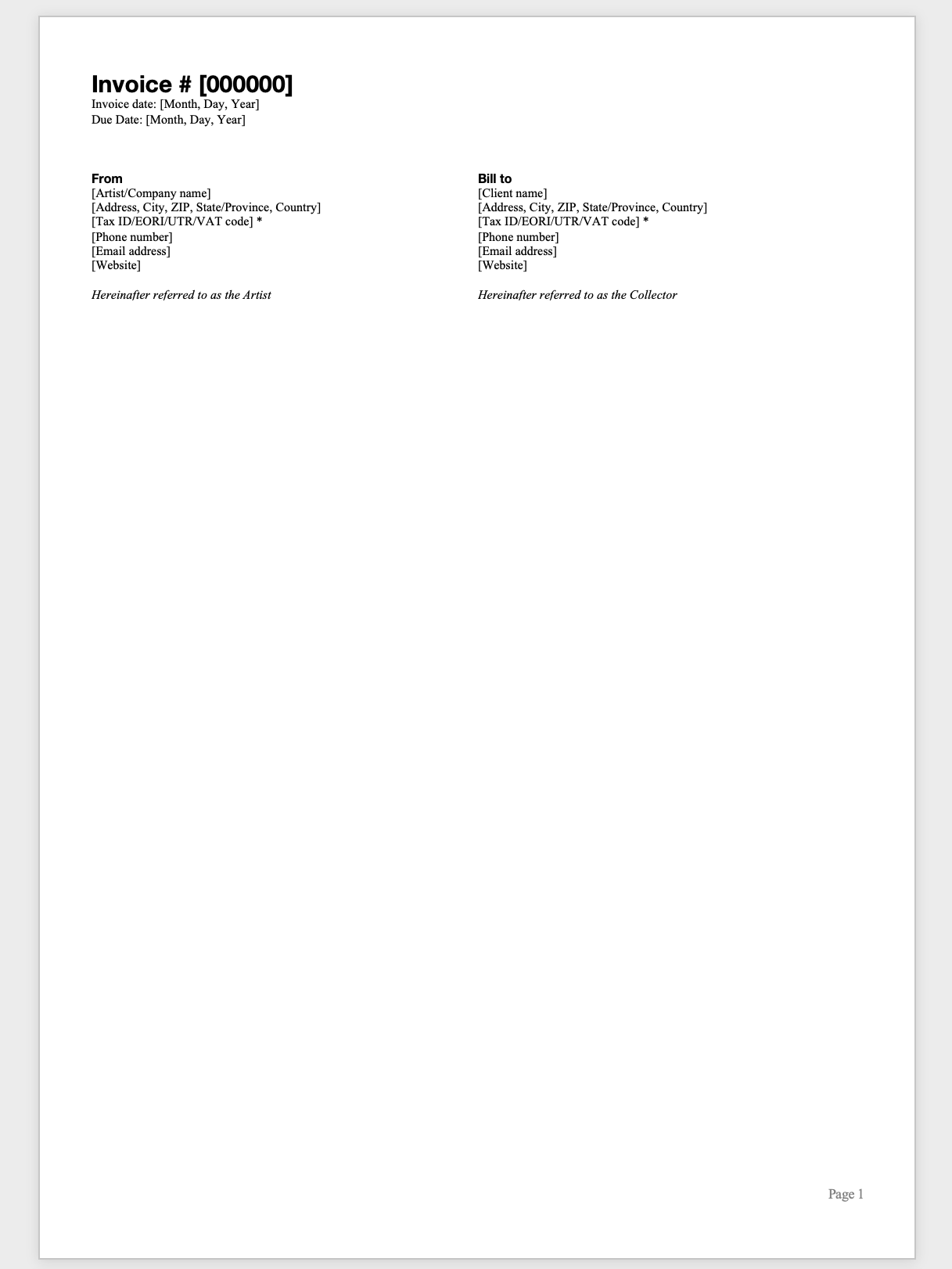Up next, we have to write down our invoice information and the invoice information of the client. Write down ‘From,’ referring to you as the seller, and make sure to include all your details, including your name, address, tax ID (if applicable), phone number, email address, and website. You could add “Hereinafter referred to as the Artist” to anticipate writing your terms of sale efficiently.