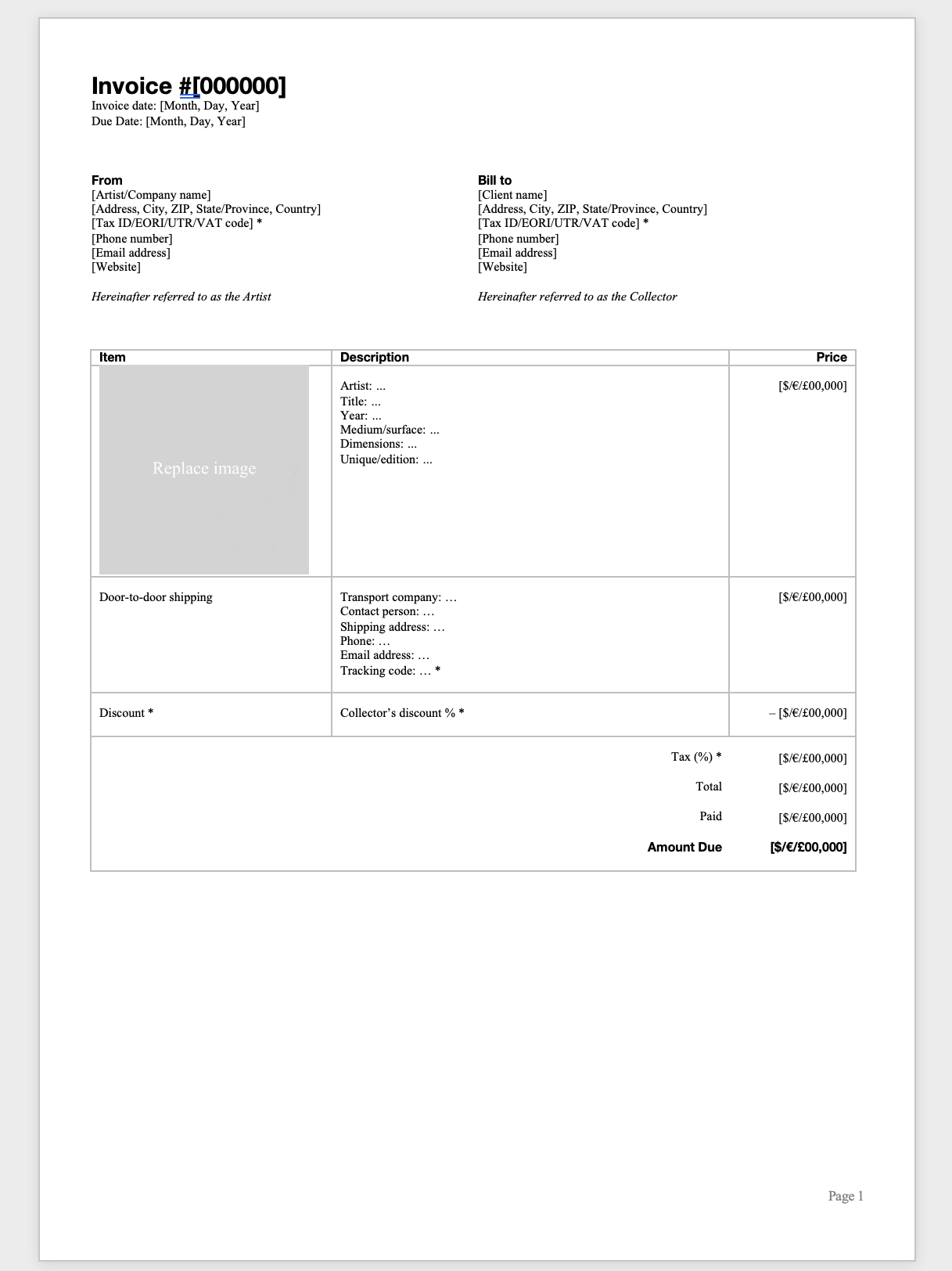 The great thing about invoicing for artists is that, in reality, all you need is a single template. Various art platforms and online resources try to sell you monthly subscriptions, expensive automatization software, or templates that do not align with the art world when it comes to design, metadata, and terms of sale. However, as a professional artist, you will be selling a limited quantity of high-value products. As a result, monthly subscriptions or automatization software are unnecessary, and they most often tend to forget to include the important terms of sale of the art industry, which protects you as the artist and your art from being reproduced without authorization, damaged, misused, or lost out of sight when entering the secondary market.