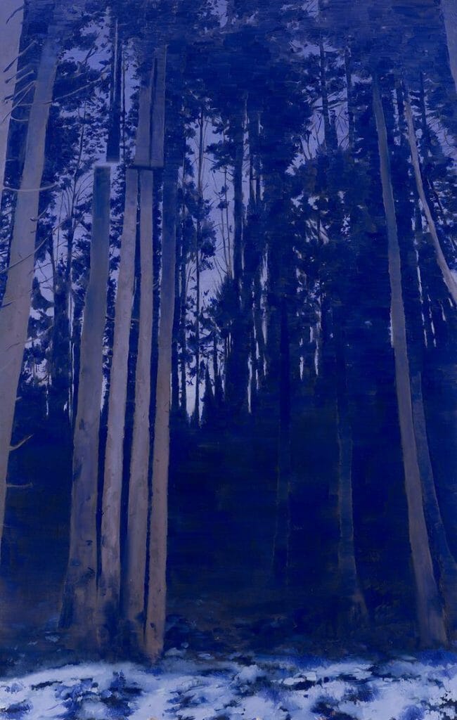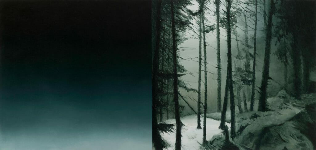 I am not sure it is about an abstract area and the forest. It’s more about the picture as a whole. If you want to follow this train of thought, it’s all abstract. The painted forest is nothing more than a collection of marks. No painter has ever actually painted everything they depicted. At a certain level, they are all just abstract marks that look like something. You do have to take both parts of the canvas in simultaneously. You cannot not see them in the same field of vision, and this is something I love about them: you take turns in focusing on each side.
