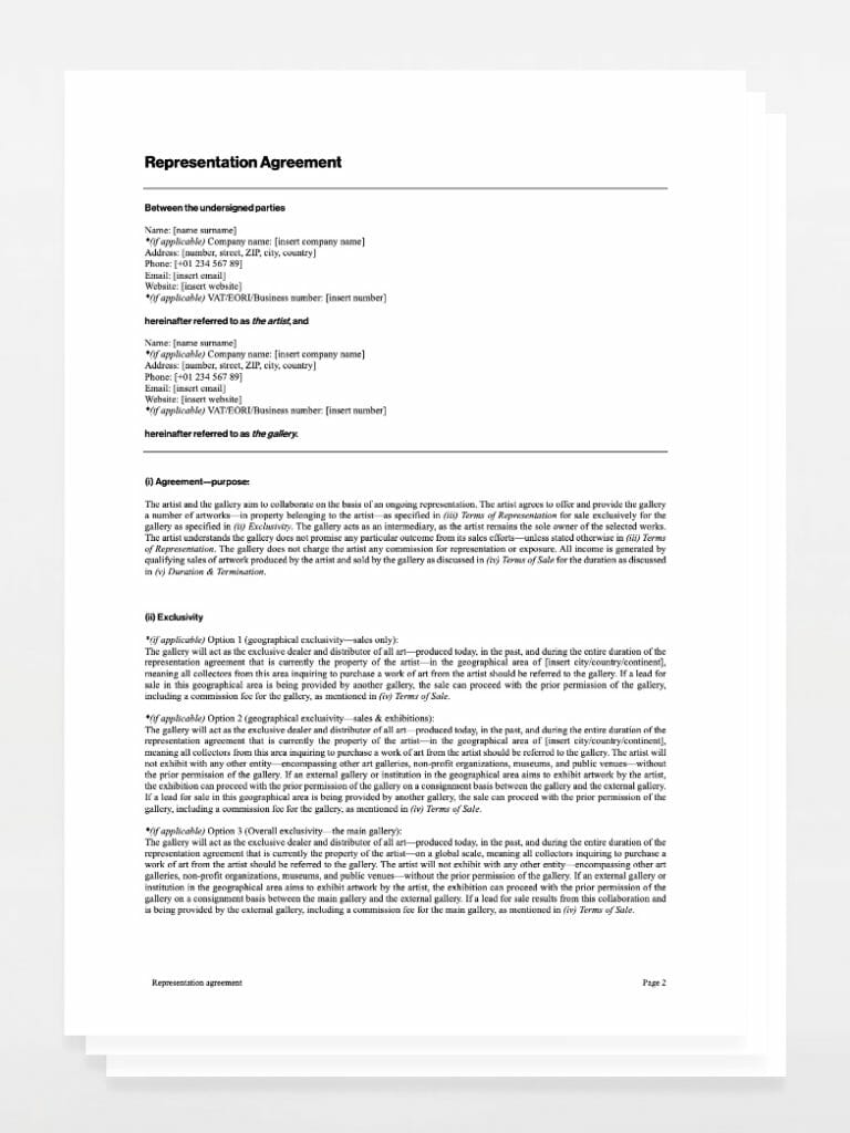 At first glance, the representation agreement and the consignment agreement look very similar. In reality, they are different in numerous aspects—aside from the common and self-explanatory paragraphs on liability, validity, or copyright. The checklist of cosigned works disappears with a paragraph on the exclusivity of the representation, the terms of the representation, and multiple changes in the terms of sale, transportation, and storage. As a result, when the time comes you can get representation, you will need a different contract and or agreement.