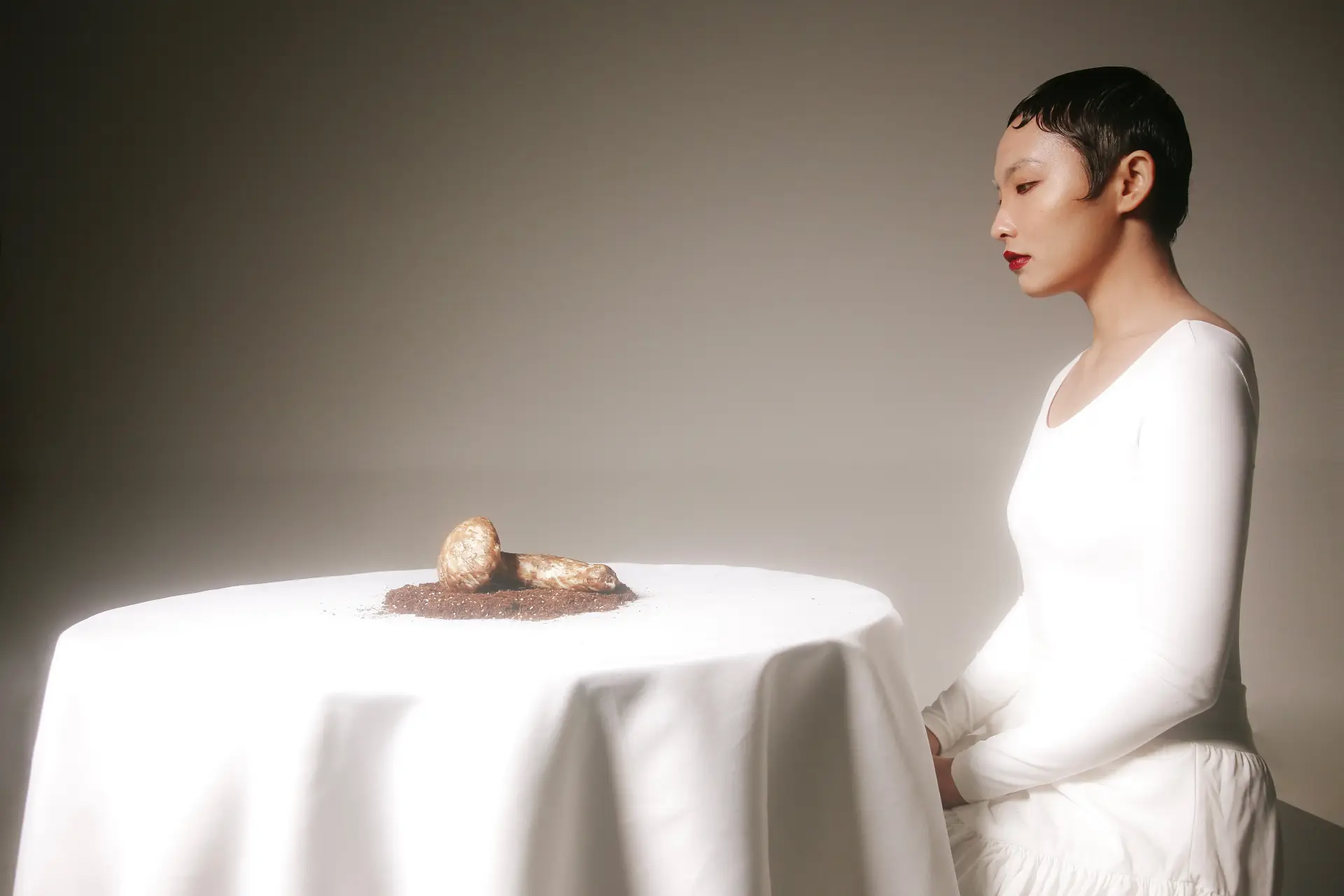 Another striking performance-based video work with an occasionally surreal tone can be found in Today I had a meeting about the value with apple, stone, and matsutake (2023), which takes place on a draped table in which the sitter interacts and converses with an apple, a stone, and a matsutake mushroom across three chapters. The project is framed by a question about dialogue between humans and nature, without centering human agency. Biological systems are treated as social communities; matter and bacteria interact to produce their own value regimes. The performance examines how non-human organisms utilize resources as a means of engaging in discussions with “value” that transcends markets or human preferences.