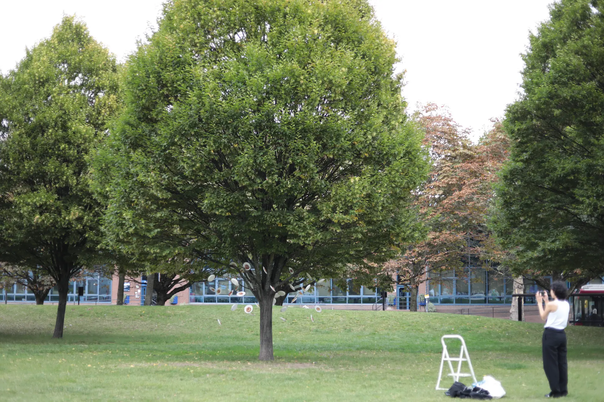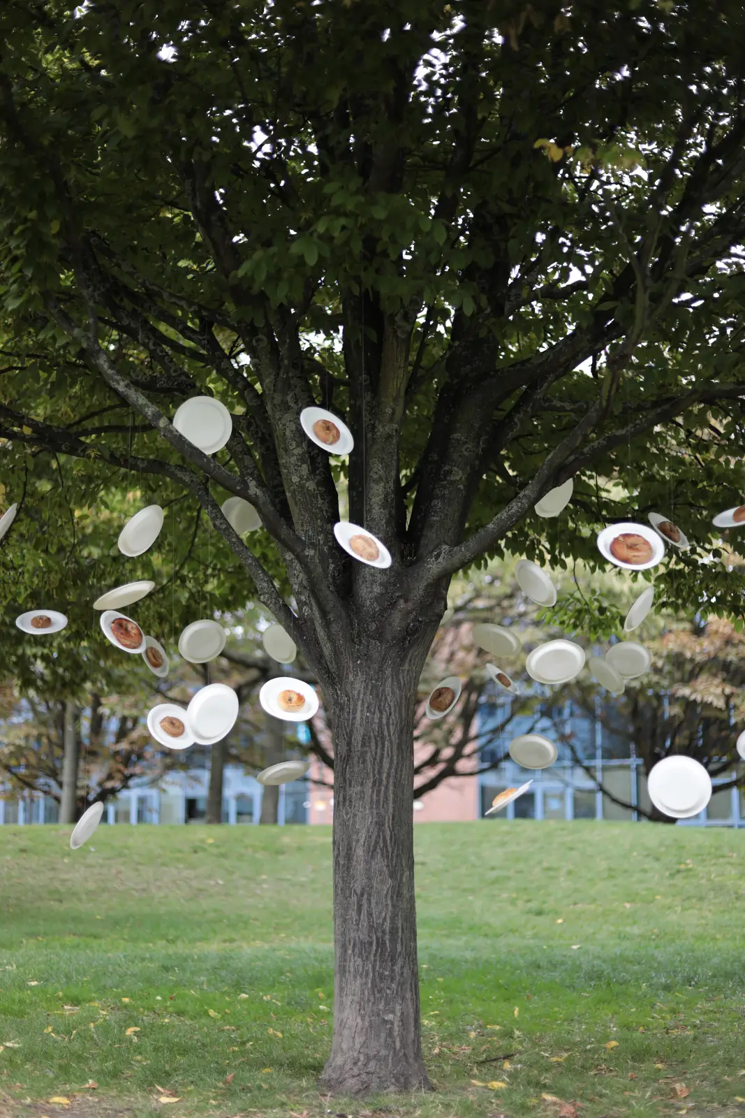 Wang’s circular vocabulary also emerges from a more socially engaged, public setting, as is the case with Free Bagel Society: Exploring Societal Boundaries (2023). Here, bagels—rings of dough—are hung on round white paper plates suspended from trees by fishing line. The absurdity of a tree “growing” bagels is deliberate; yet, the work’s stated focus is on the relationship between social distance and amicability in urban life, as well as on how the distribution of free food exposes unexamined motives and habits. Wang asked each recipient why they took free food from a stranger; responses often admitted a lack of prior thought, suggesting that small gestures can reveal latent patterns of trust, need, and desire. The circular plate and the bagel’s ring form a precise continuation of Wang’s lexicon: simple, repetitive forms configured for exchange rather than contemplation. Suspension recurs as well: objects hang, sway, and wait for activation by passing bodies. The project remains true to the larger practice by valuing participatory encounter and by choosing materials that communicate without didacticism.