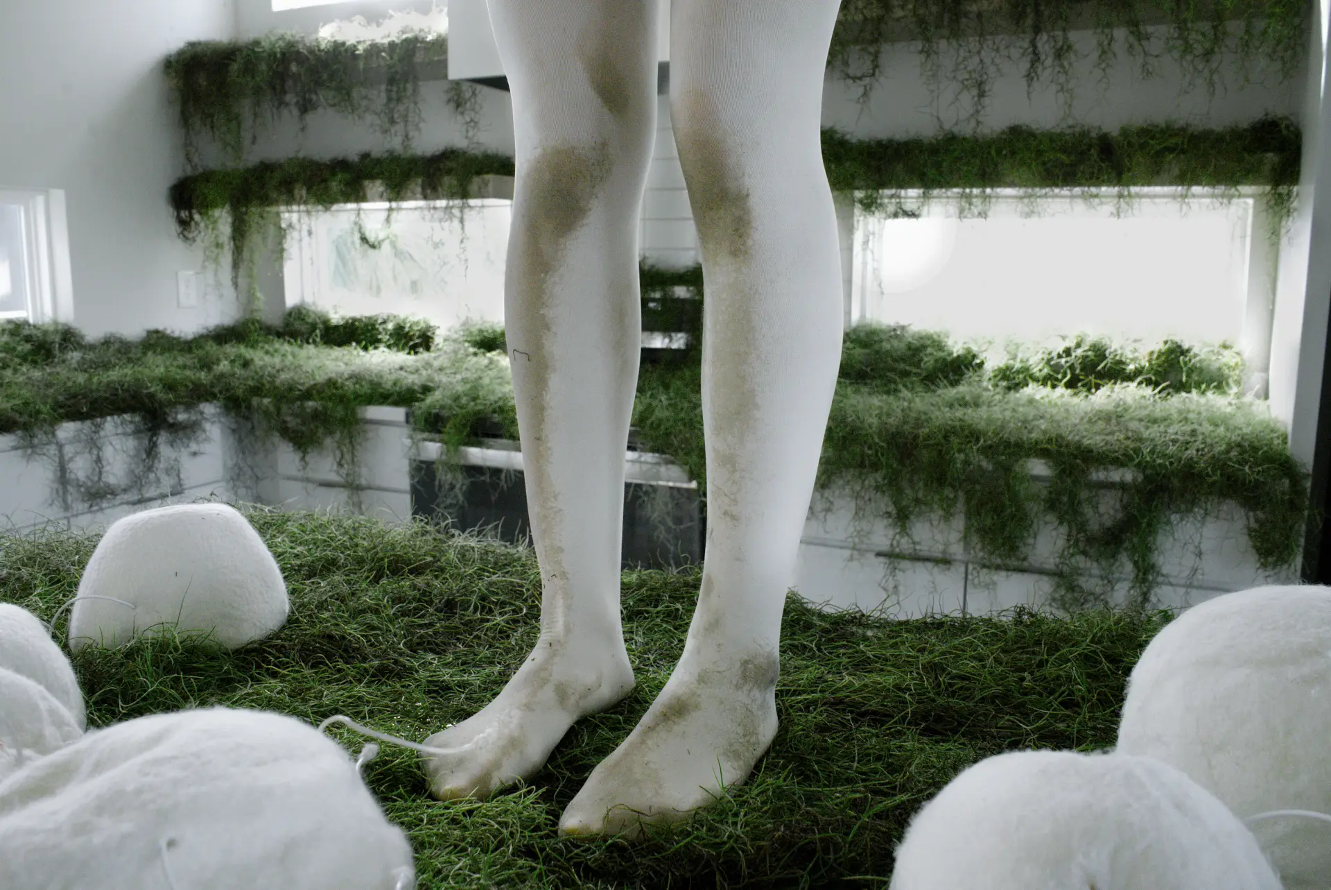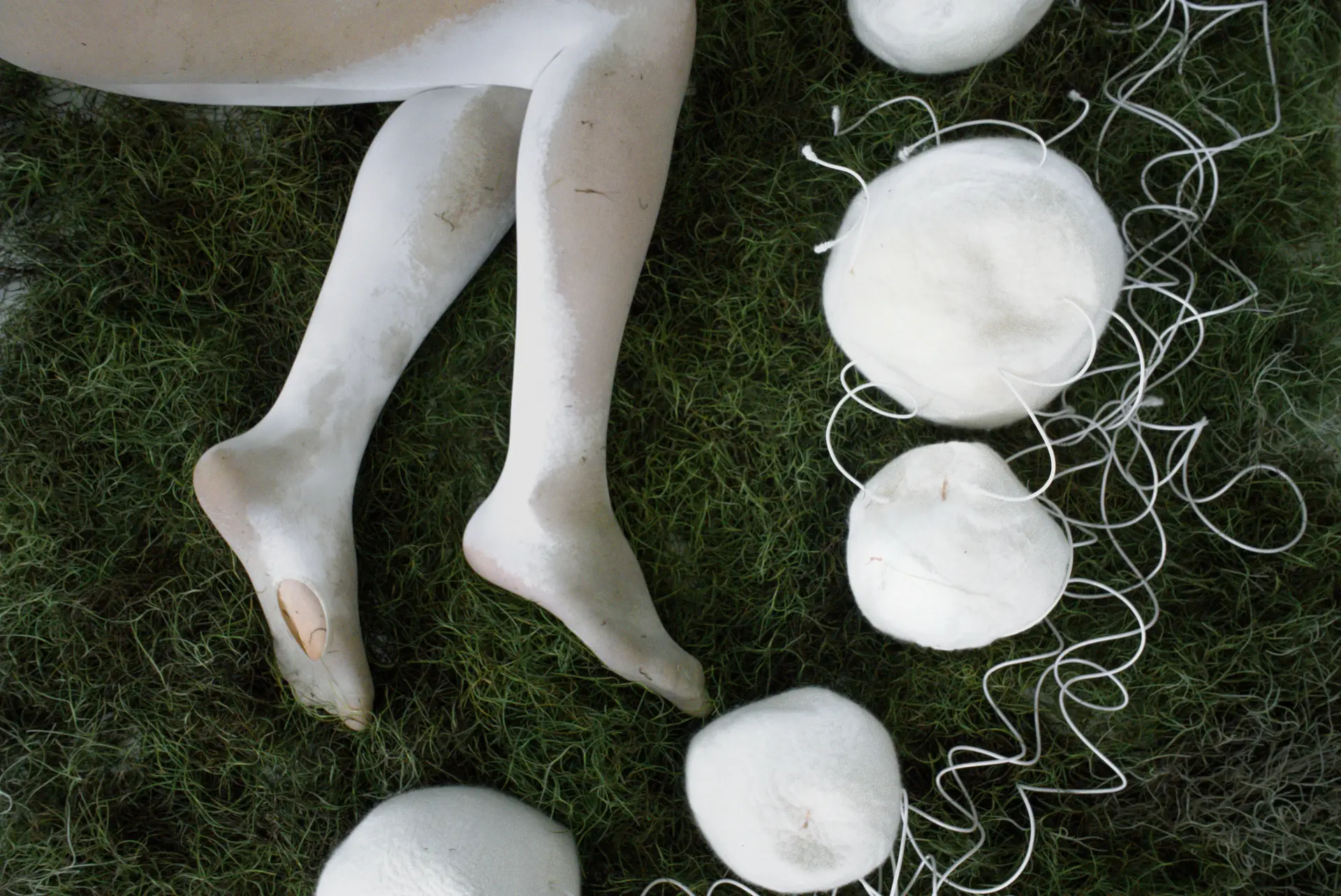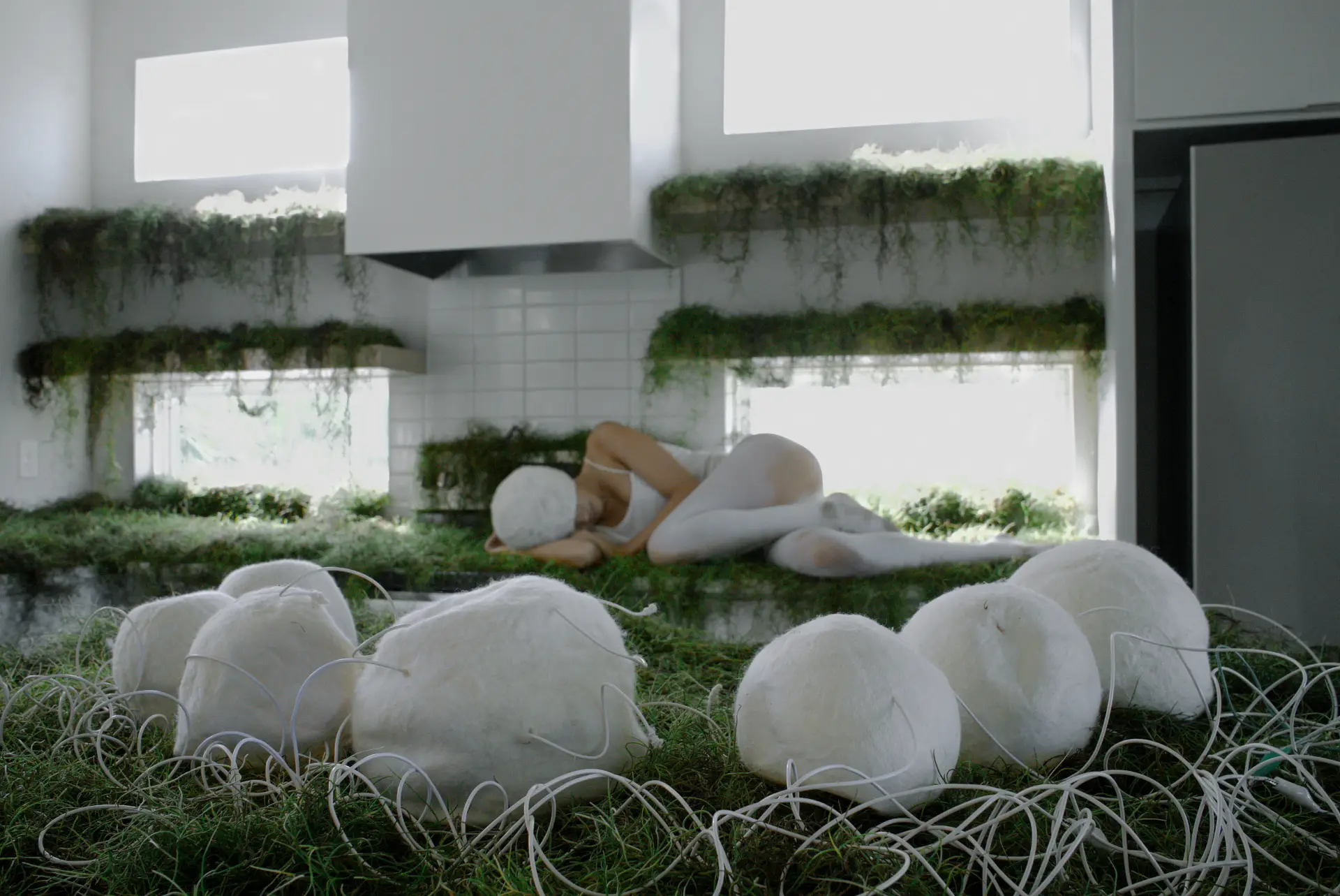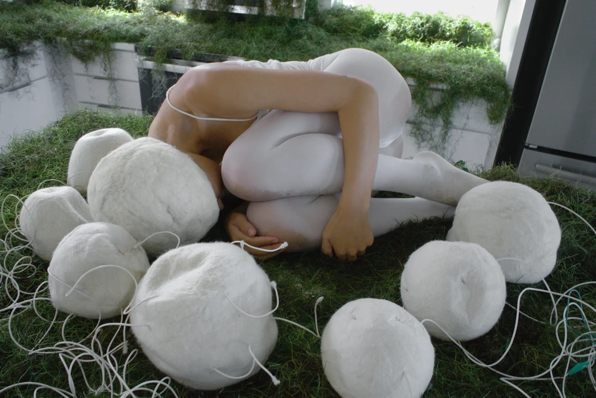 A related vocabulary of spheres is also present in Cocoonloo (2022), an interactive sound installation featuring performance and printing components. Installed in a white kitchen interior that is softened by living grass, the work situates the performer among white wool spheres. The project’s starting point is the silkworm and the question of whether modern life might recover biological rhythms that high-speed civilization tends to disrupt—as if this kitchen has been retaken once more by green nature. Meditation and Zen frameworks are named as references, and the installation proposes the cocoon as a metaphor through which to pause and recalibrate. The whiteness of the space is not an erasure; it is the consistent field that enables the wool’s tactility and the grass’s color to register. Spherical wool forms echo the silkworm’s process while retaining their status as encounterable things rather than images. The performer’s body is neither passive nor dominant; it is situated among spheres that suggest protection and gestation. Here, as elsewhere in Wang’s work, the repetitive unit is an instrument for enabling different rhythms of attention.