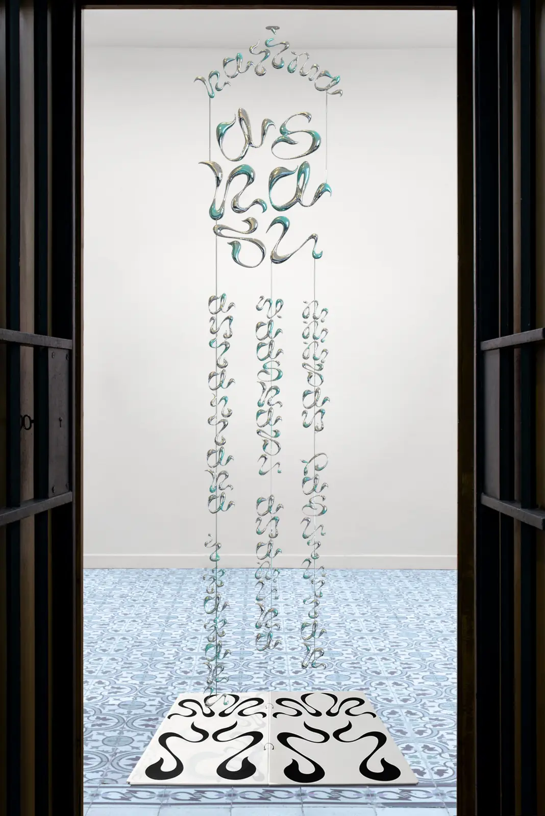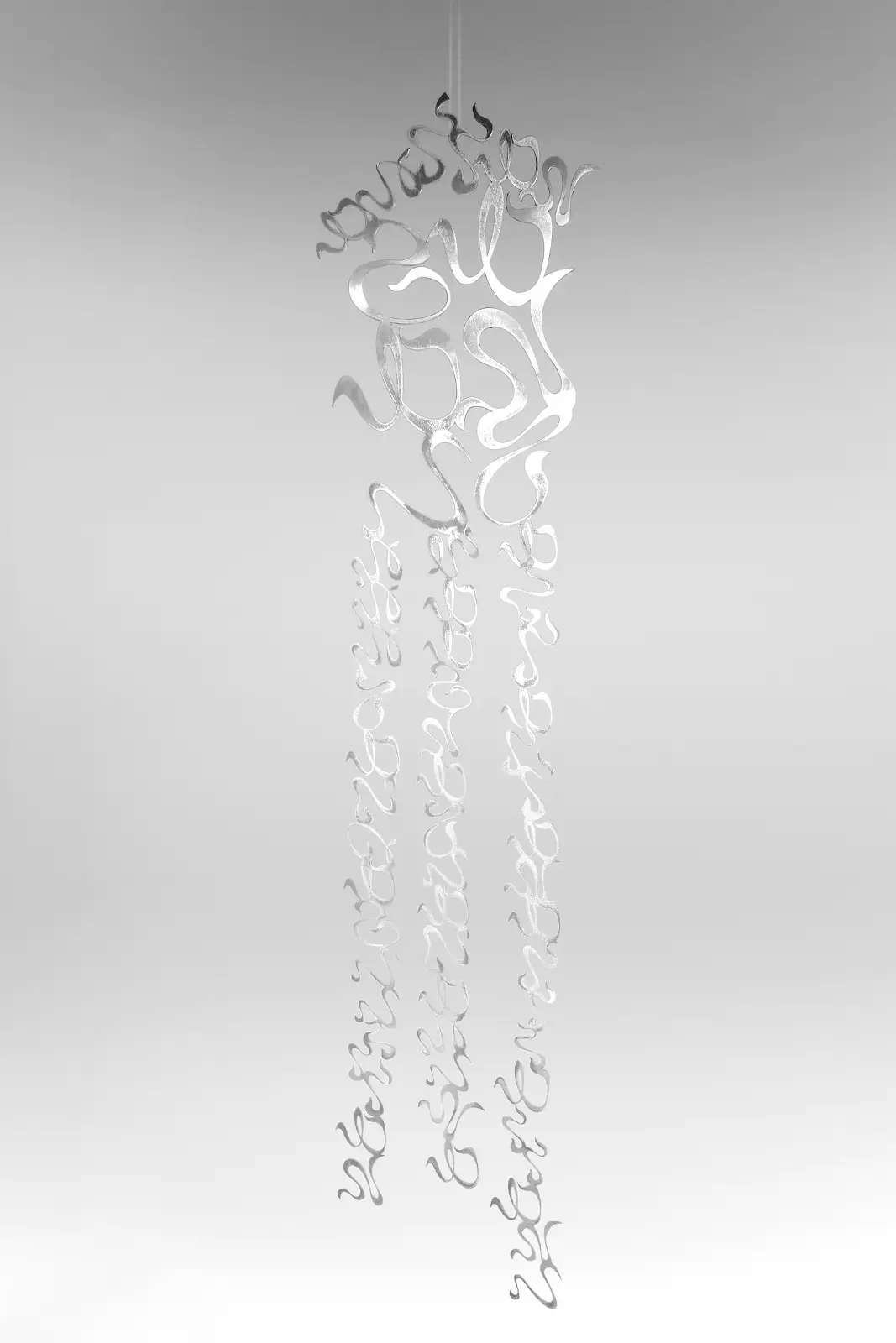 Another example can be found in the negotiation of cultural symbols in Echo of Signs (2025). In Echo of Signs, Wang transliterates the phonetic elements of the Shahada—a text that has surrounded the artist since childhood—into a visual language and cuts that language into aluminum. The industrial material, the precision of laser cutting, and the suspension of the piece hanging from the ceiling or a cut-out of traditional calligraphic forms and pasted into contemporary exhibition conditions. The artist notes that, upon contact, the collisions of metal awaken sleeping sounds; the work is not a silent script but a resonant object. The suspension keeps the text in a state of slight motion, inviting viewers to attend not only to form but also to the sonic and tactile dimensions of the material. Importantly, the project is described as a reexamination of a cultural code. Wang names this as a way to preserve cultural memory, while acknowledging that meaning is neither a fixed inheritance nor a total abandonment.