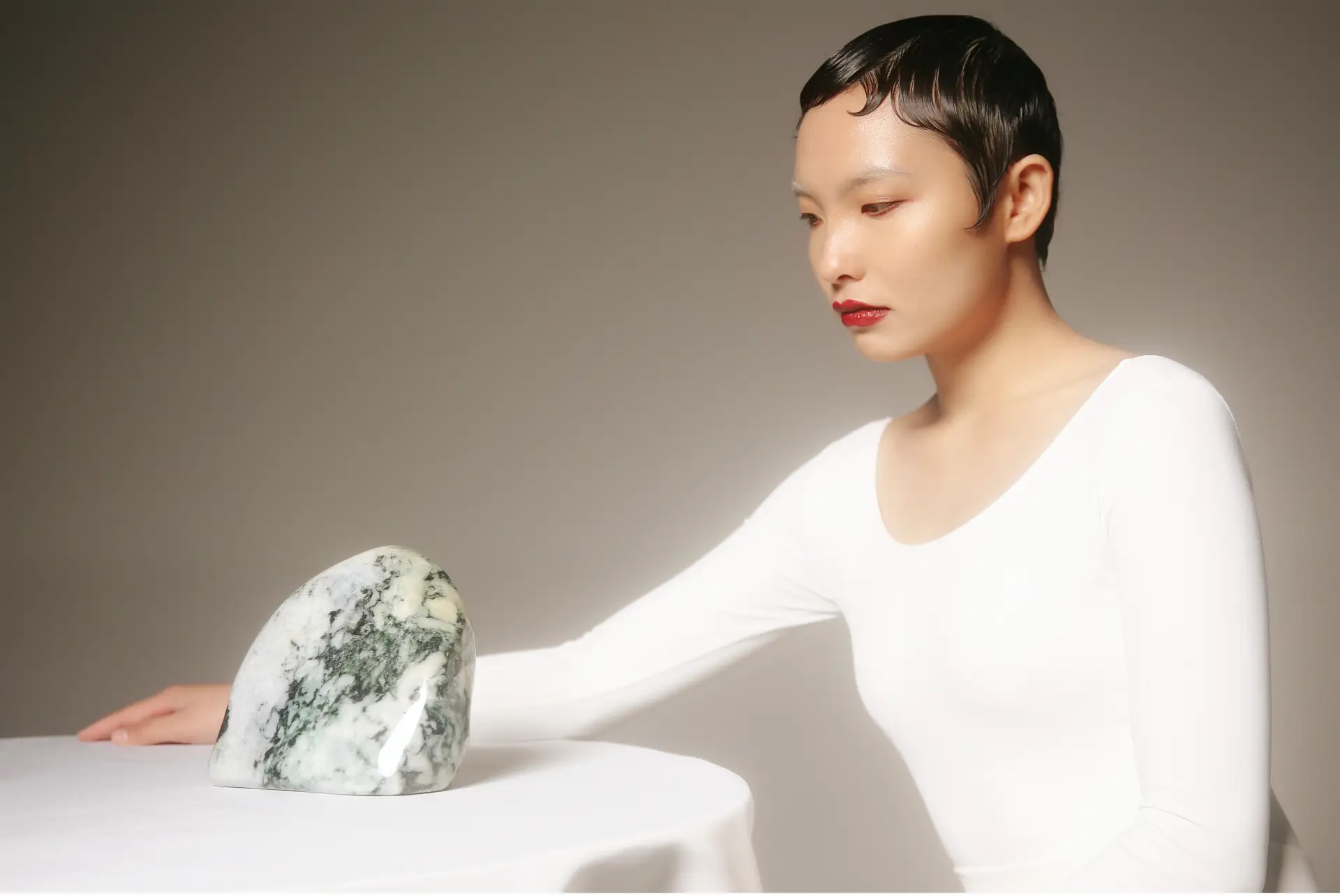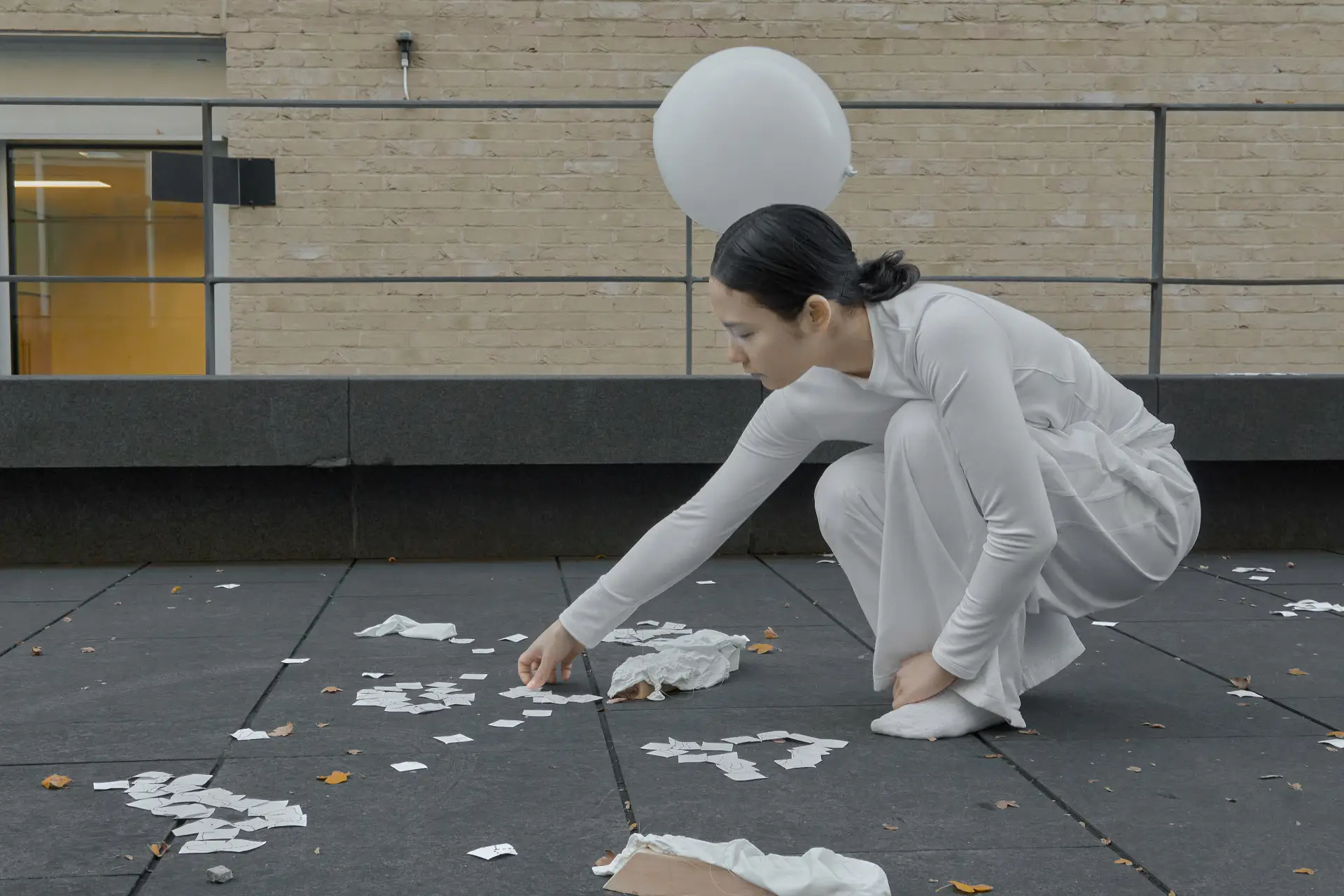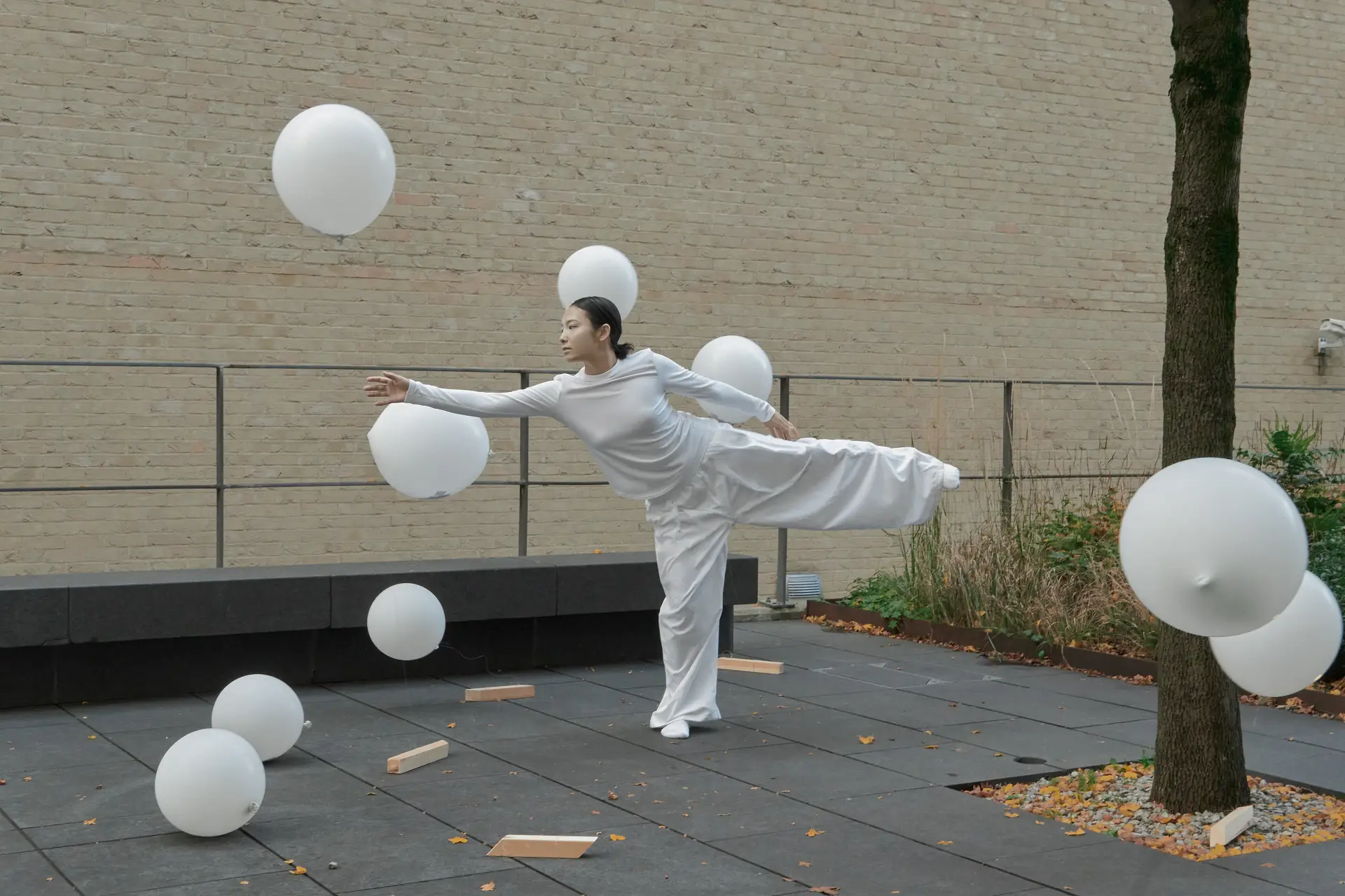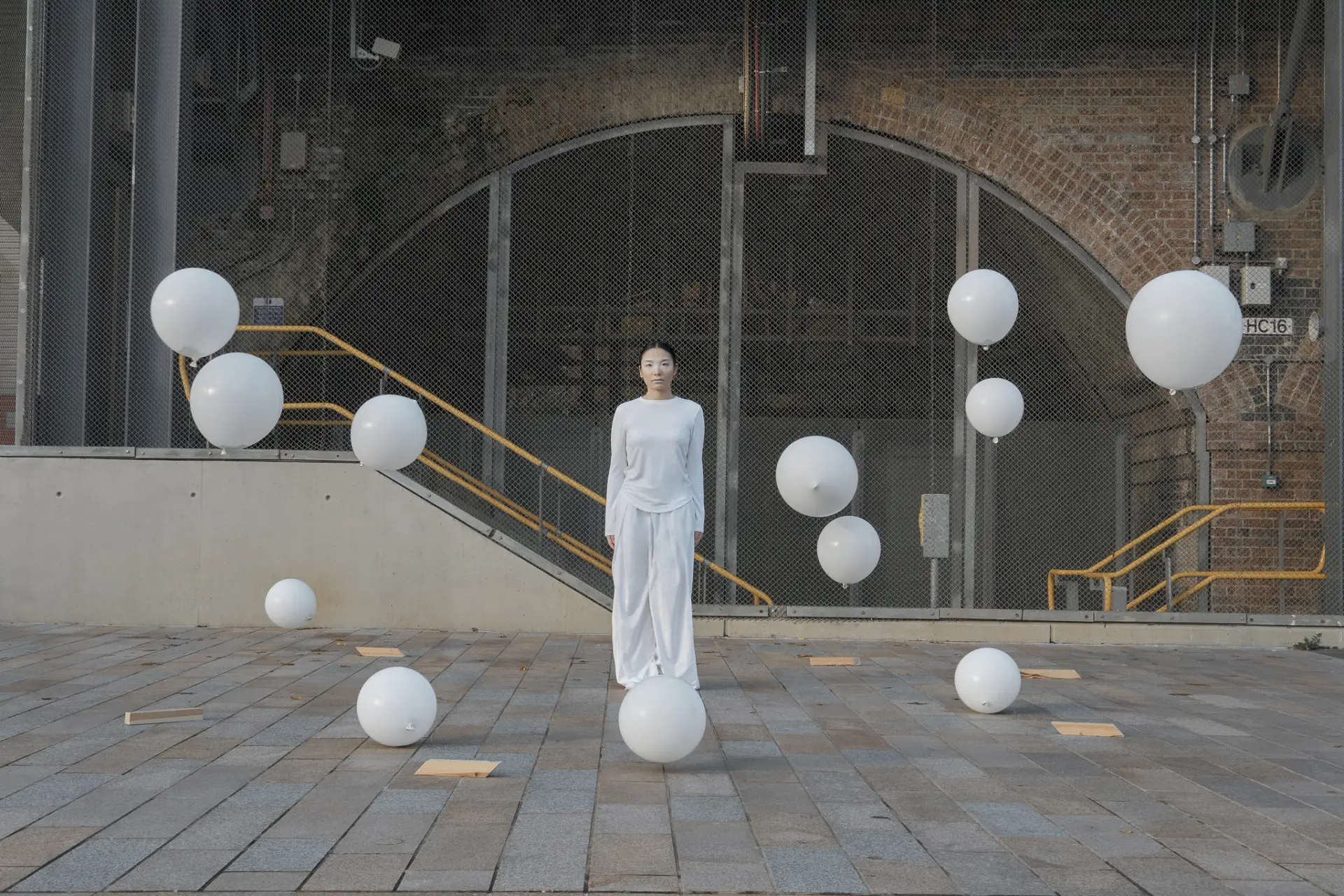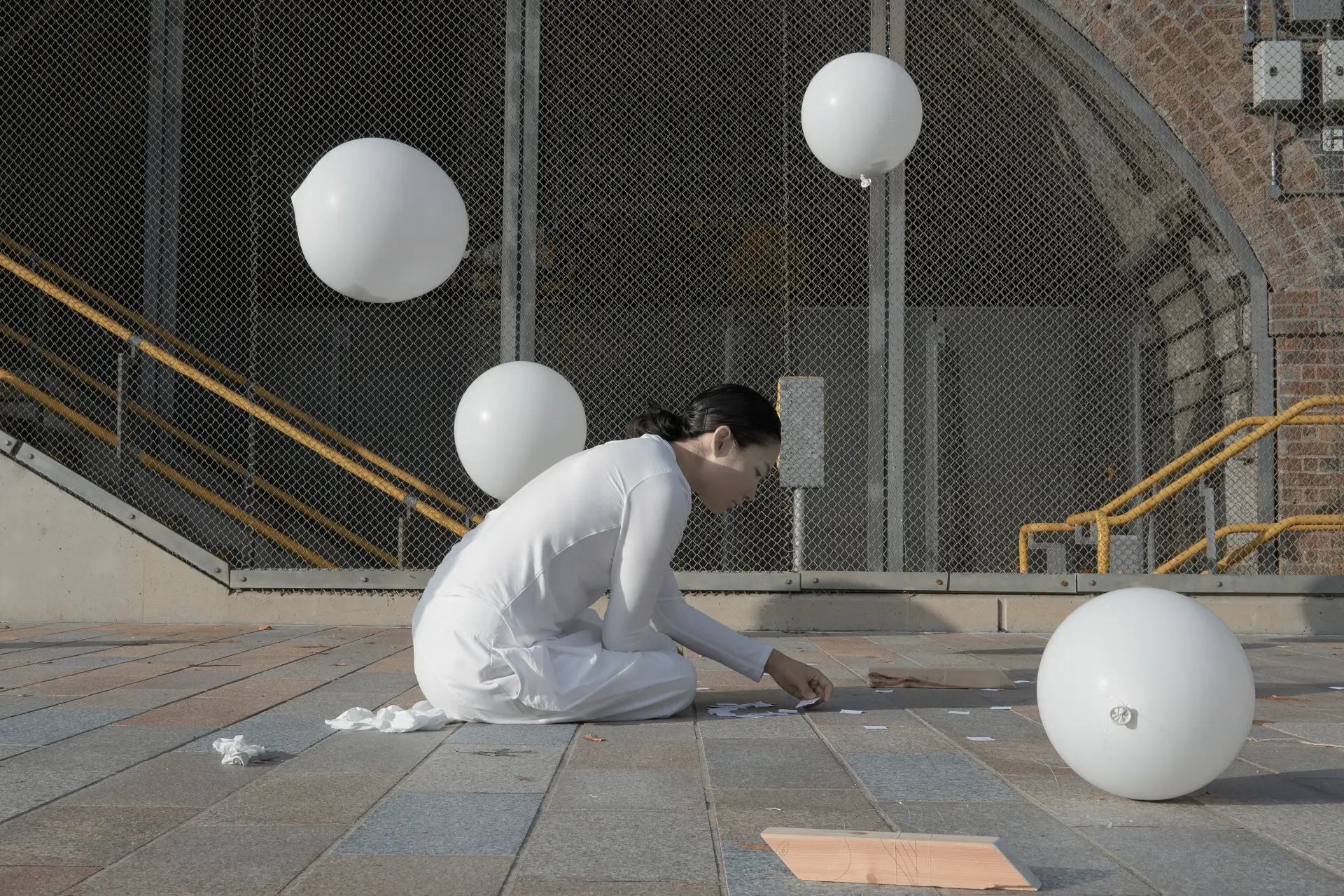 White, in these works, is a constant. Drapes, clothing, paper, balloons, interiors, and plates often share a common, pale register. Wang’s description of “emptiness” clarifies why: white creates a receptive field for sensory events and small gestures. It operates as a threshold. Across projects, white is not purity but a condition for noticing; it allows the spheres, the water’s shimmer, and the sound’s modulation to hold attention. In installations that depend on present-tense sensory adjustment, such a field is functional: sightlines, depth, and highlight are all regulated through it.