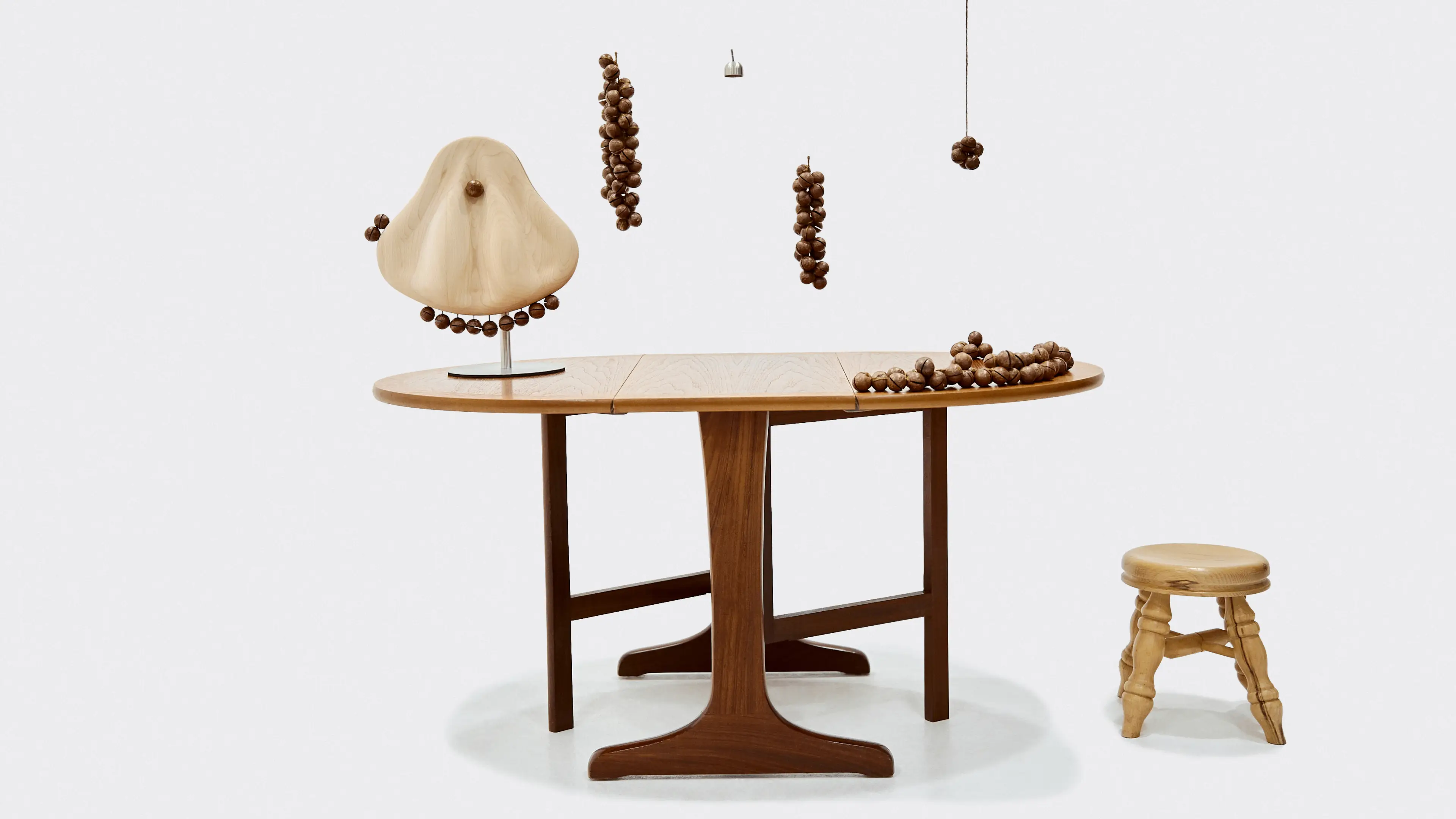 The counterweight is a recurring strategy in Wang’s artistic thought process. Consider Side Dish (2024), a performance and ritualistic installation featuring a wooden table, a stool, musical eggs, wooden spheres that produce rattling noises, a bell, and a kinetic sculpture with more wooden spheres. Drawing on the artist’s upbringing in their parents’ restaurant—where the pace of cooking and eating framed food primarily as fuel—the work proposes a counter-environment. Conceived as a “side dish” to a meal, it sets conditions in which diners can slow down and attend to taste and texture.