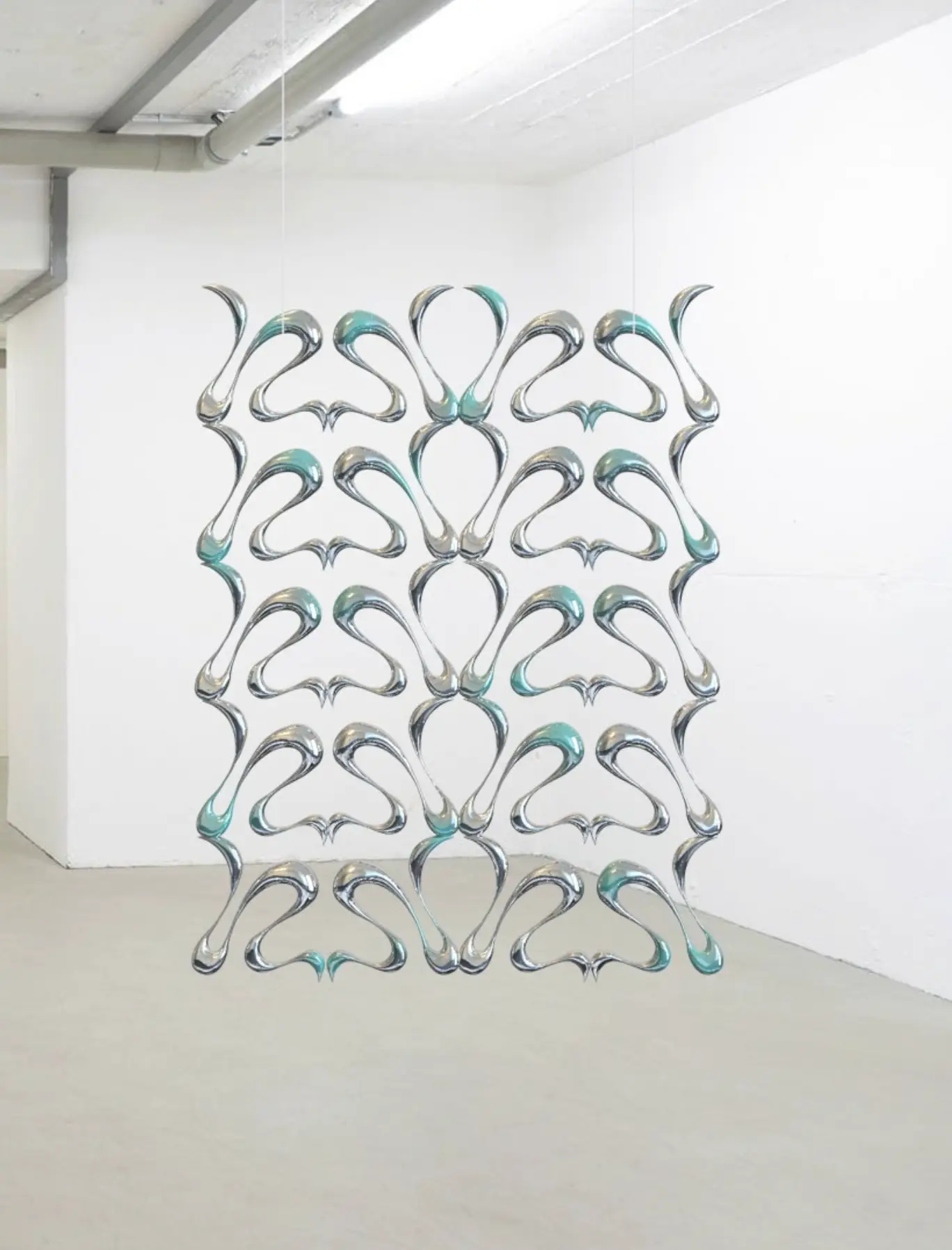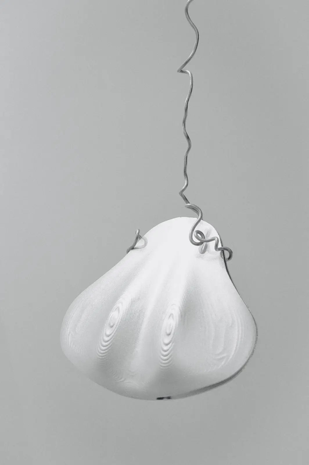 The everyday and the ready-made hold a central position in her sculptural practice. Seashell (2024) translates the familiar into sculptural form by suspending an aluminum and glass shell from a metal string. The suspension mechanism again prepares the object to meet a body; it hovers at a height and registers slight motion. The material choice of aluminum and glass is consistent with the practice’s interest in reflective surfaces and precise edges, yielding a surface that catches and reflects light, volatile and ephemeral.