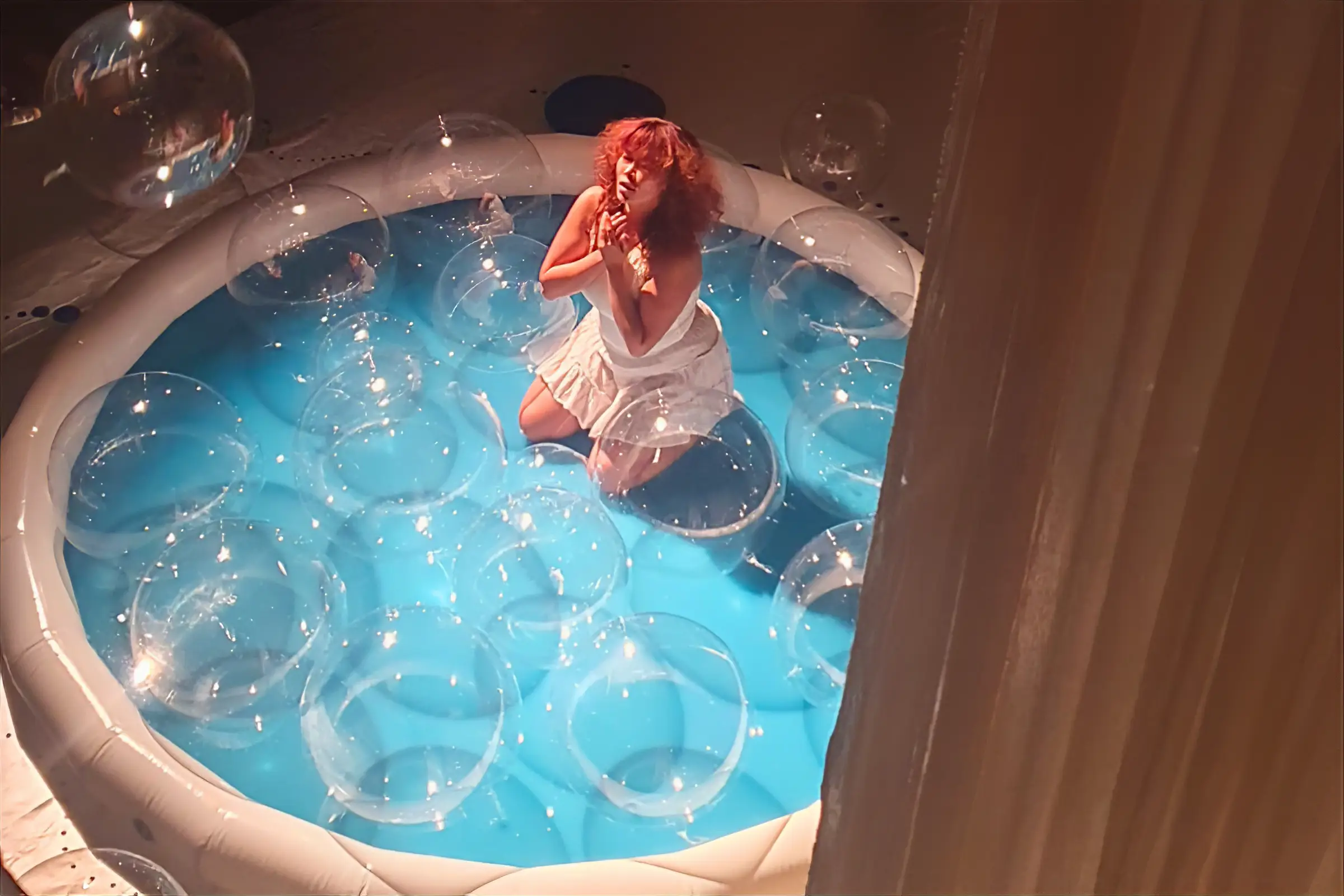 One of Wang’s most recent projects, titled Fluid Whispers (2025), exemplifies the artist’s approach to installation and live performance from a nearly panoramic perspective. The work centers on a shallow, round pool filled with a small volume of water, installed within white drapery. The floor is covered in rings and constellations of blue sand; large bubbles descend into the space; and the performer, dressed in white, explores the environment throughout the action. Sound is not merely a backdrop but a structuring principle: droplets and composed music articulate the temporal arc and guide attention. In developing this project, Wang formulated a rule-based experiment that required participants to improvise and immerse themselves guided by sound, composed in collaboration with three other artists. The same logic underlies the performance environment: not the elimination of thought but a balanced tethering of attention to present sensory cues. Within the draped enclosure, sightlines are partial and mobile; the viewer must walk and re-position to glimpse different elements. The circular plan of the pool, the spheres of bubbles, and the dotted patterning of blue sand create iterative rhythms that echo a cycle of sound and silence. The title’s emphasis on fluidity and whispering describes both the materials and the mode of address: gentle, persistent, and immersive rather than declarative.