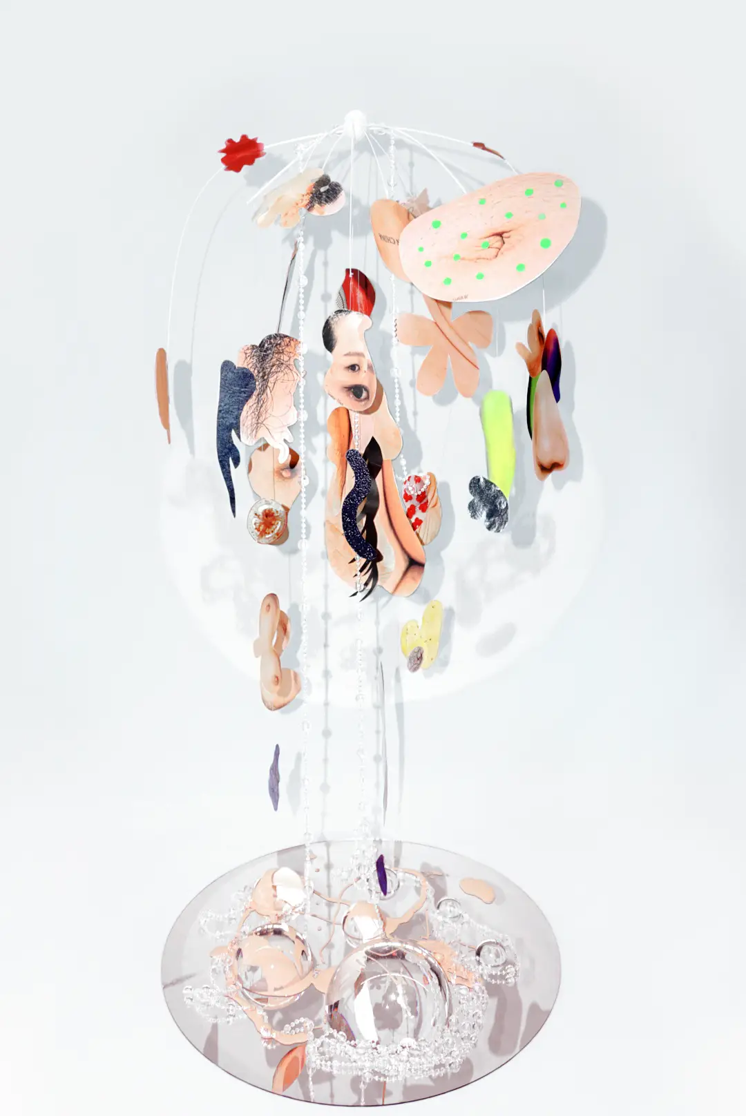Earlier projects illuminate how this method develops from the artist’s own image-work. Self Gaze (2021) uses photography, collage, mirror, and magazine fragments to assemble a composite portrait from parts—the artist’s cropped eye, a hairline, a nipple—and extends the assemblage through contributions gathered by open call. The aim is to challenge the external and internal scrutiny directed at women’s bodies and to propose “self-gazing” as a practice of acceptance. In this project, Wang utilizes an editorial and graphic skill set to explore questions of ownership and image circulation; printing becomes a means of release from anxiety rather than a means of accumulating self-possession. Although less site-responsive than later installations, Self Gaze shares interest in the partial view, the suspended fragment, and the role of simple materials (string, paper, reflective surface) in organizing our perception.
