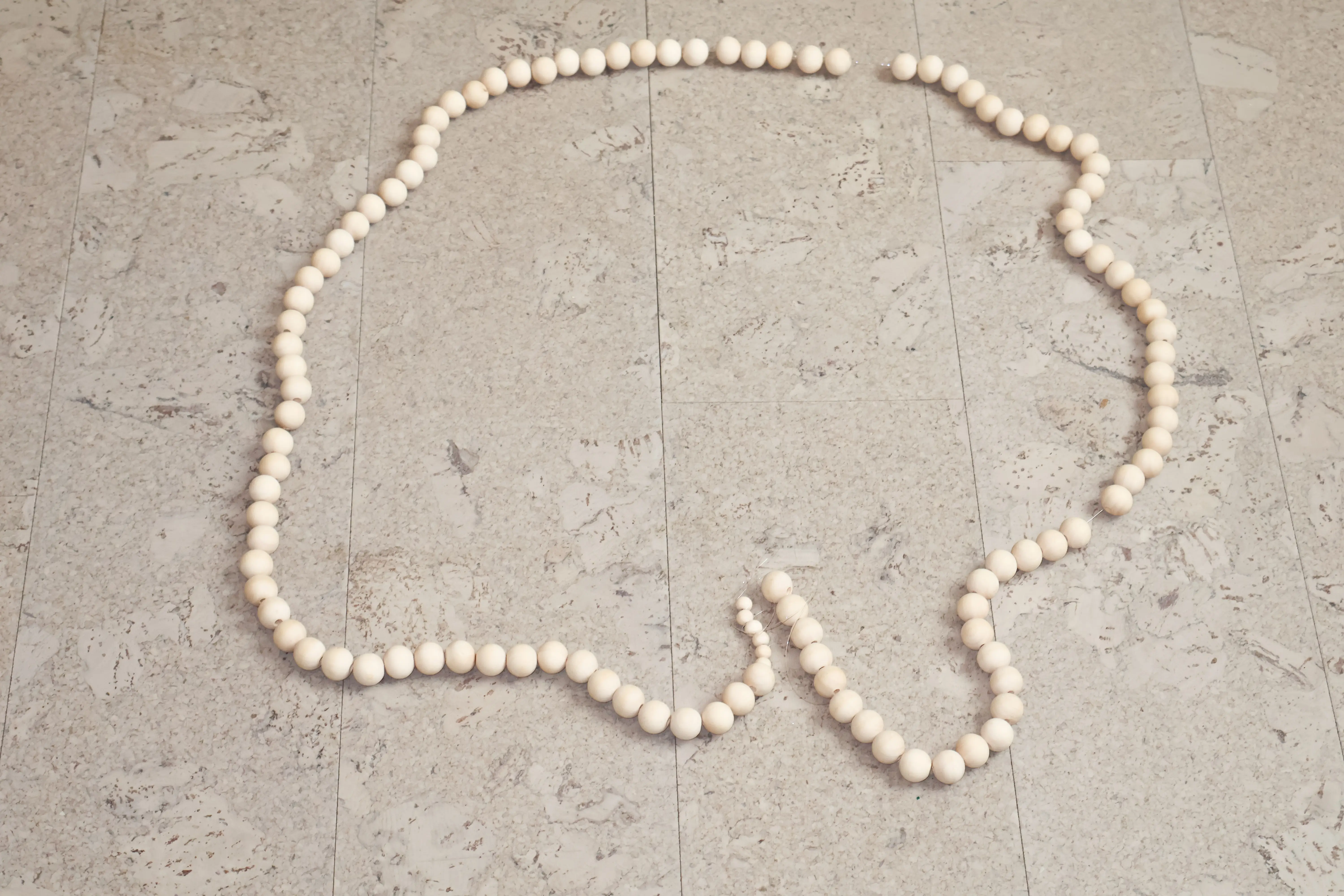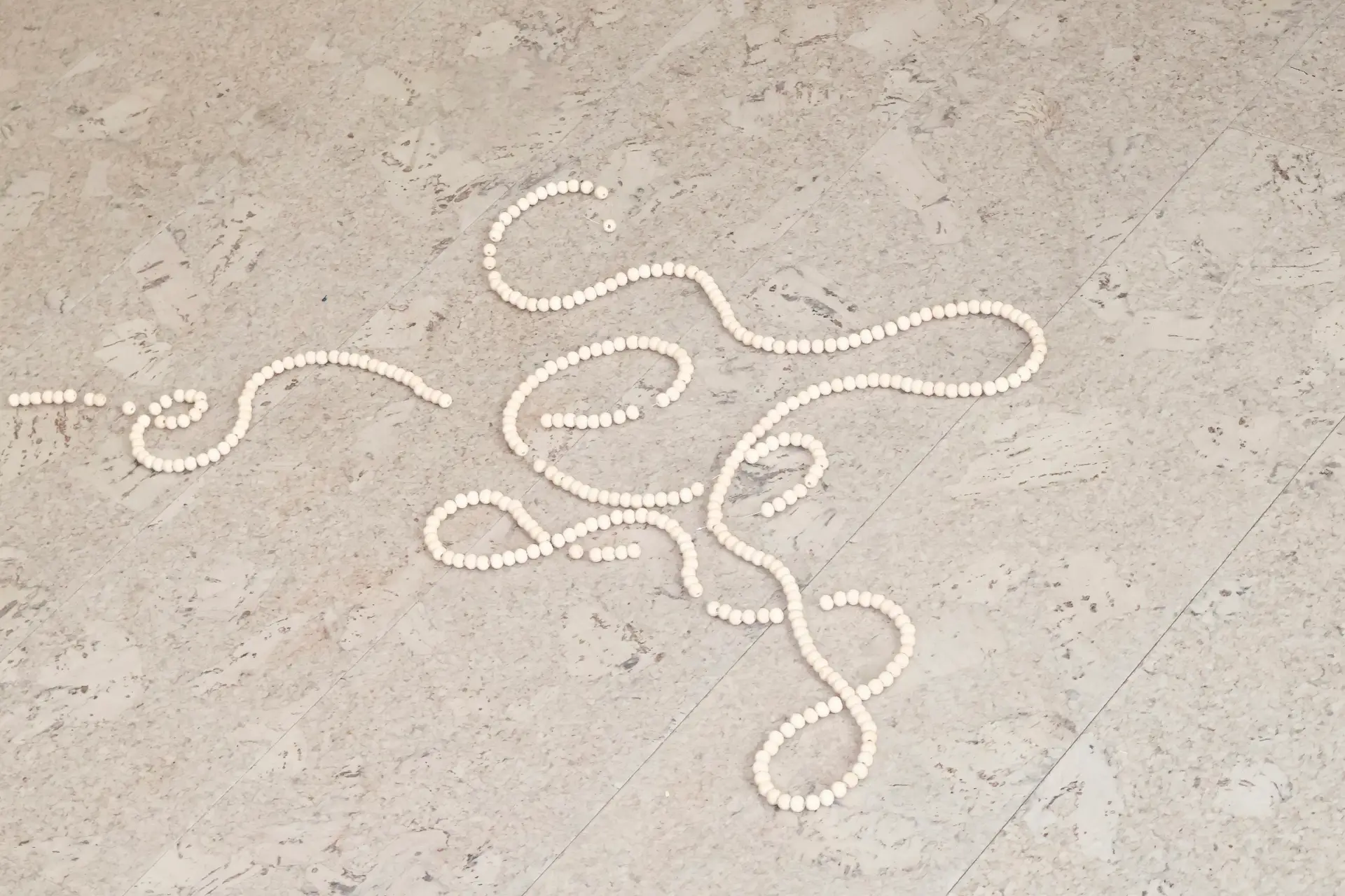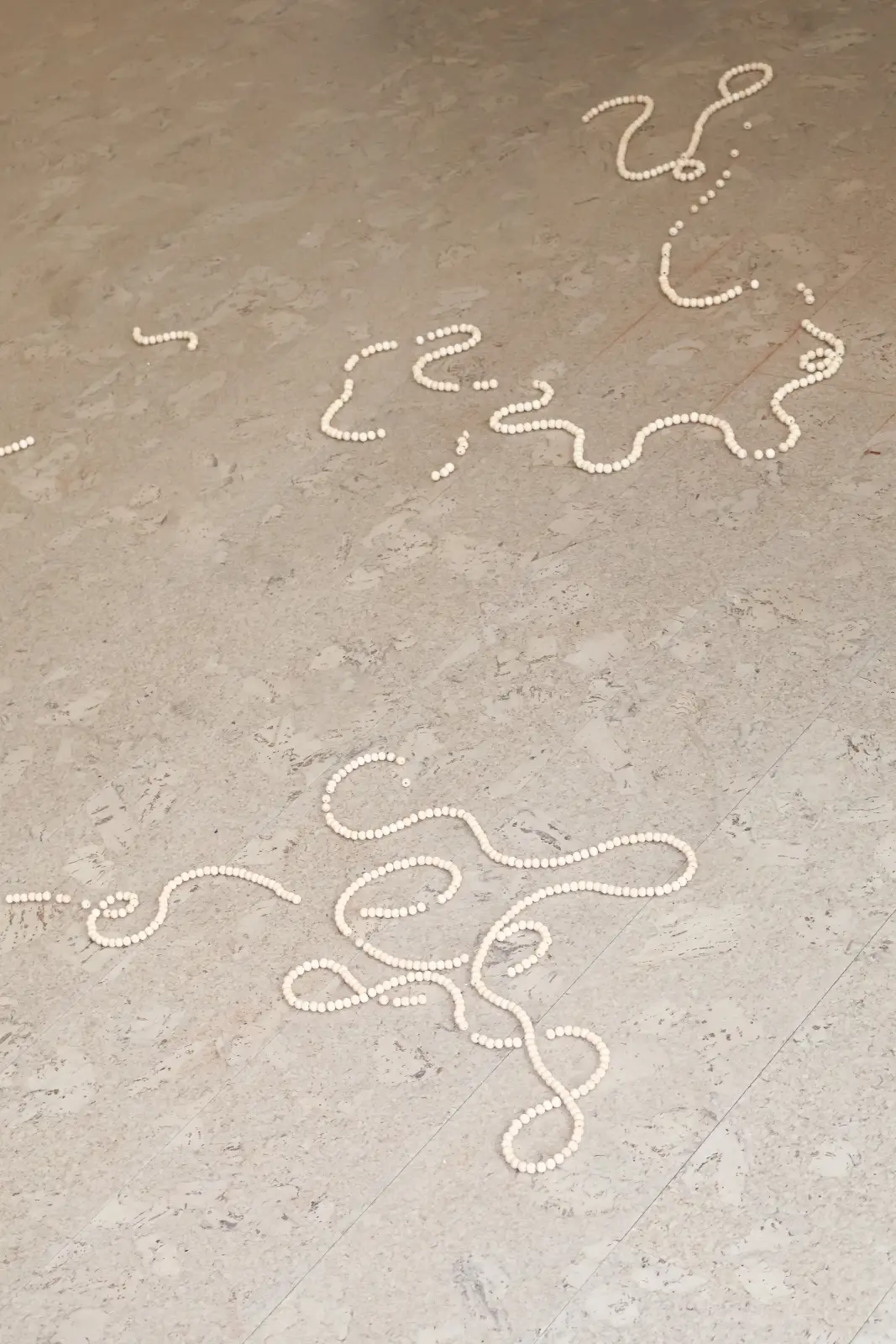 If Fluid Whispers explores circles generated by water and sound, Moving through the beads (2024) reduces the circular unit to its minimalist form: the bead. Wooden beads threaded on fishing line lie on the floor, and over time, they lose their sequence as the line slackens and the chain disintegrates. The piece designates counting as a daily ritual of contemplation, explicitly naming the tracing of one sphere to the next as a way to dissolve restlessness. The work does not fix the chain but acknowledges entropy as part of the ritual’s reality; the beads’ eventual scatter is integral, not accidental. The choice of fishing line emphasizes transparency and fragility; the wooden spheres provide uniform tactility. In combination, they produce a structure that—like breath counting or rosary practice—relies on iterative touch and is inseparable from duration. The recurrent appearance of spherical elements in Wang’s practice is direct here. Each unit is a locus of attention, and the chain’s arc across the floor suggests cycles that are continuous but not permanent. The work’s material modesty is consistent with the larger aim of inviting the body into simple, sustained contact with matter.