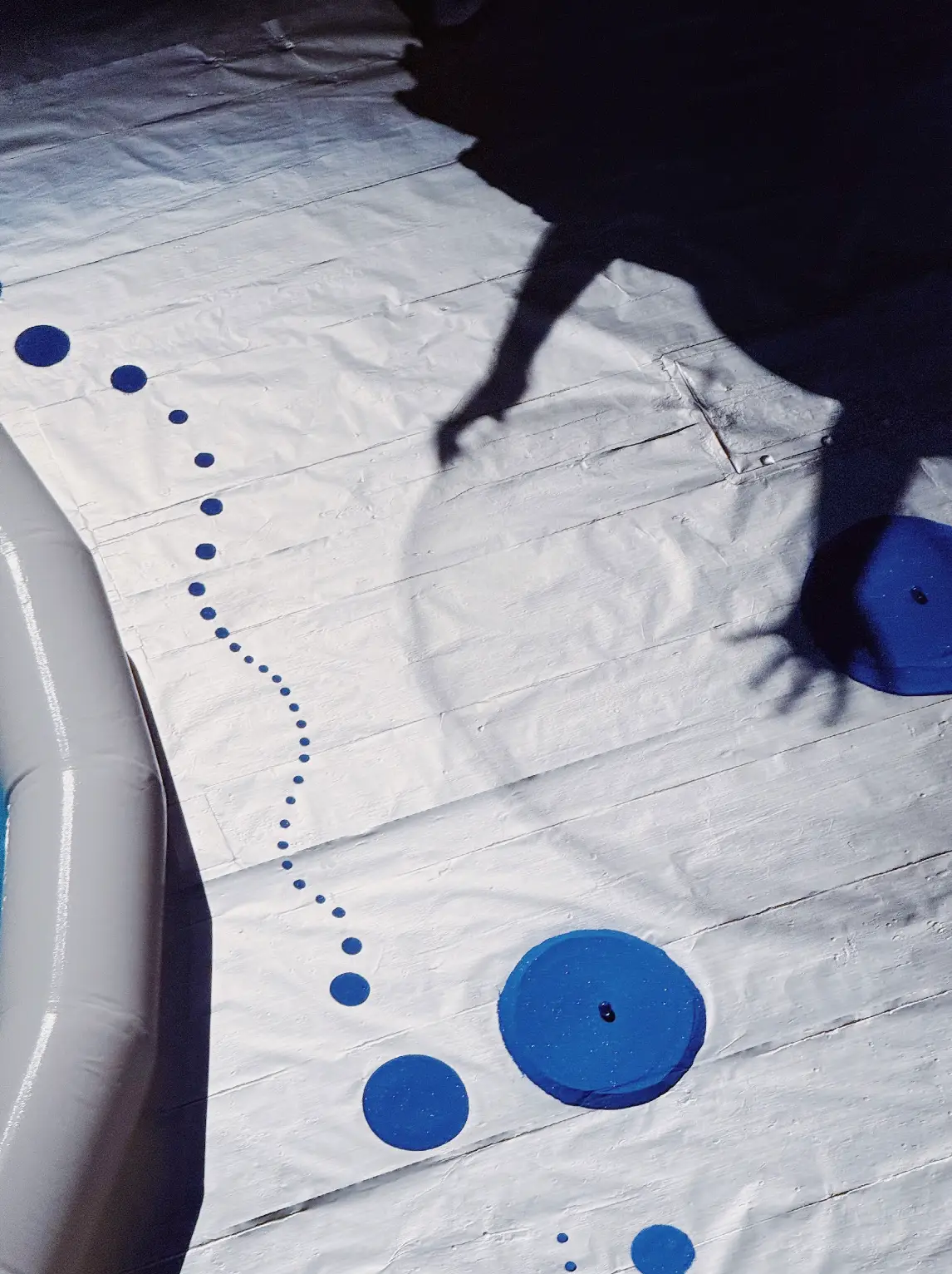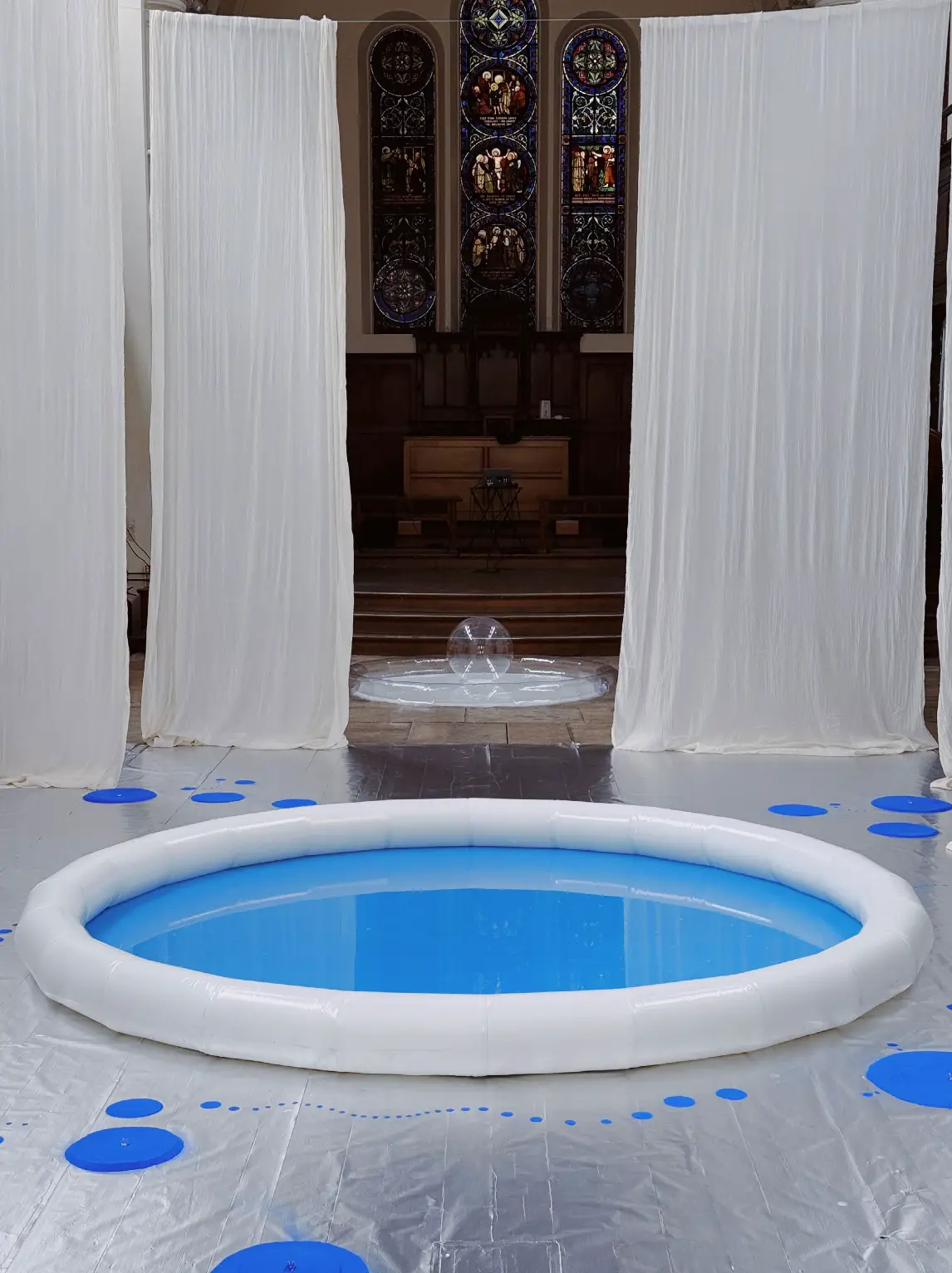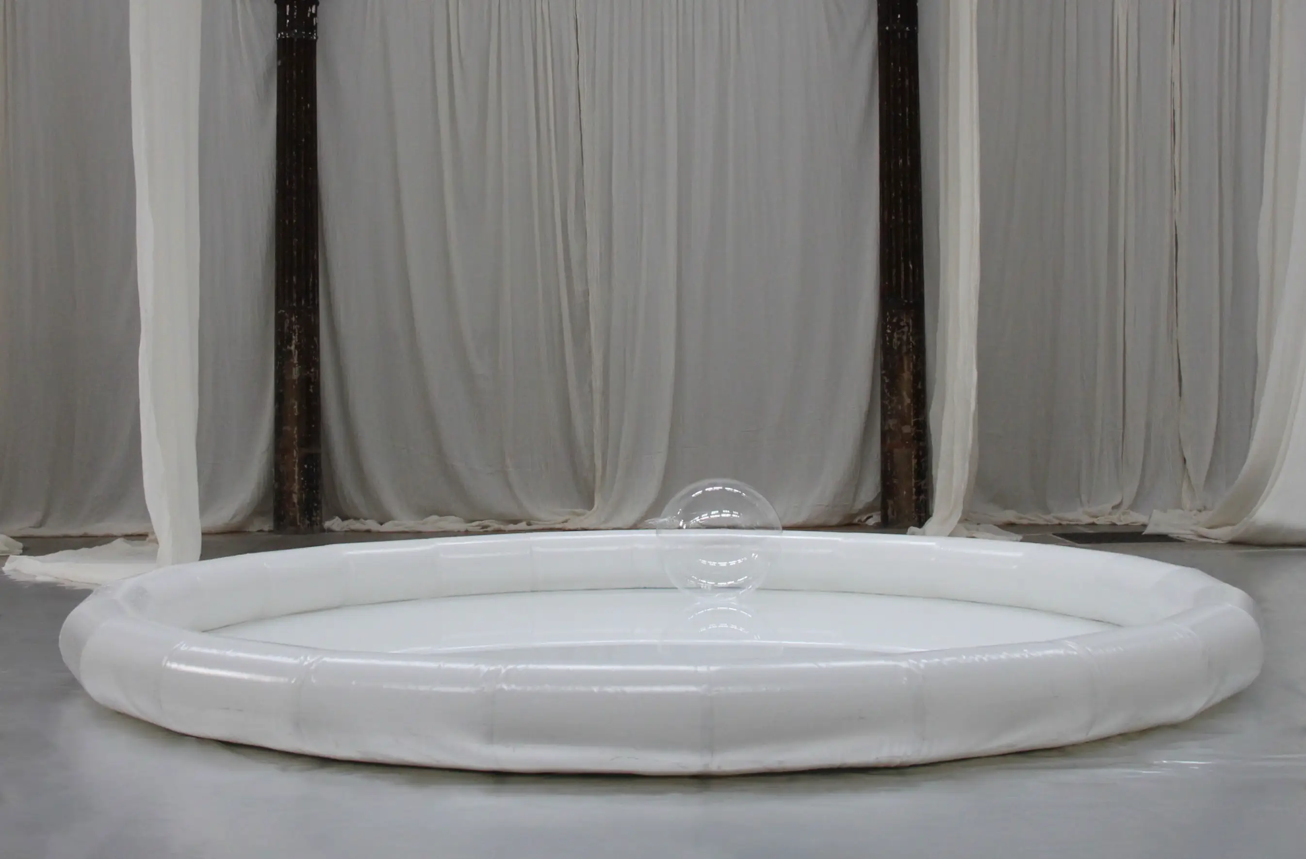 The concluding gesture of Fluid Whispers—the performer cutting and re-wrapping a section of the drape before leaving the pool—introduces a decisive but unadorned act of transformation. The environment is not left pristine; it records a trace of intervention. Wang has described the conceptual center of the project as “emptiness,” not as absence but as a state of still, open possibility like the attentiveness that can accompany bathing. The reflections of light on water emerged during the work’s development as another element to be pursued, expanding the project’s vocabulary of subtle, circular optical events. The environment is therefore provisional by design: the artist anticipates further cycles of activation, as well as integrated guidance for performers and audiences. The circular and spherical lexicon—pool, bubbles, dots—serves more than visual coherence; it provides a formal armature for sustained, cyclical attention, aligning material repetition with a ritual of presence in its emptiness.