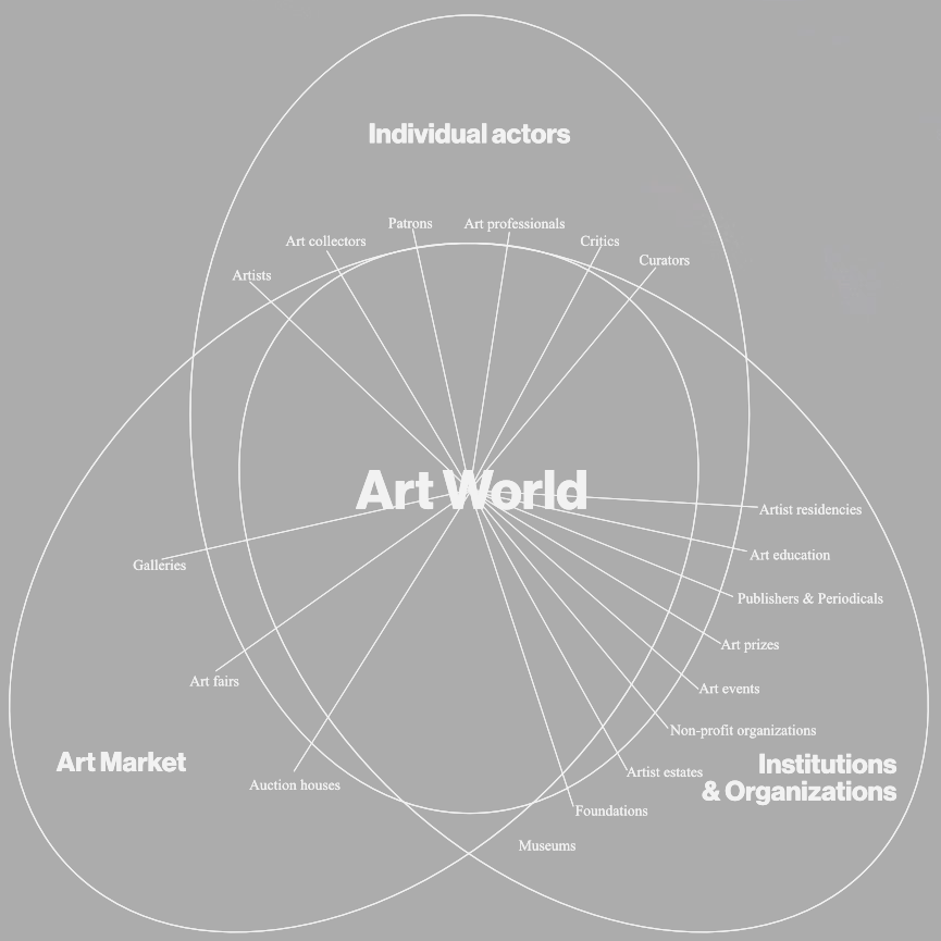 Therefore, this article presents a complete and industry-approved overview of the most important actors and entities in all their different shapes and forms. We have identified the three main spheres of the art world; the commercial art world or the art market, the critical or institutional art world, and, to conclude, the numerous individuals navigating between both spheres.