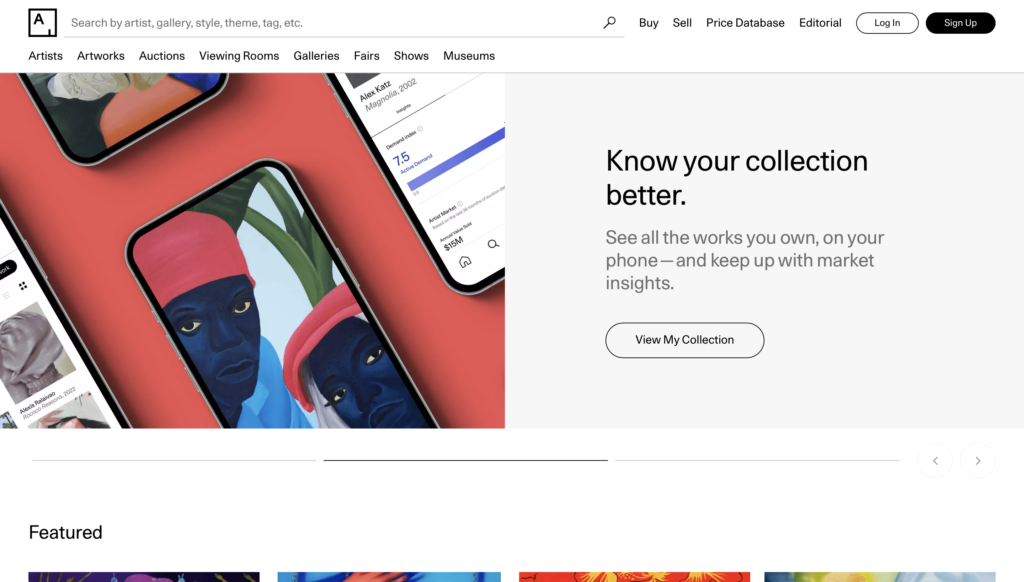 Furthermore, one can distinguish three different types of online marketplaces. First and foremost, dealer-oriented online marketplaces such as Artsy and 1stDibbs, where only renowned dealers can access their program. As a result, we encounter a very high-end selection of artists on those platforms, with Artsy being the most important online marketplace for contemporary art in the art world. Here, most often, the commission is low, and the platform sets very high standards to ensure a quality and trustworthy experience for collectors.
