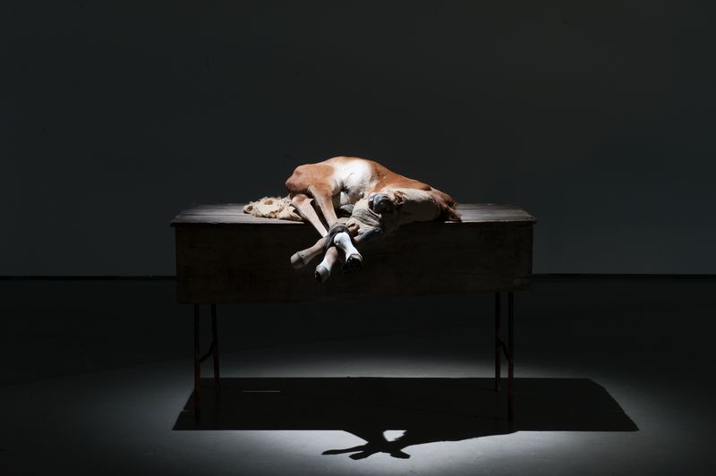 With To Zurbarán from 2015—one of her many equine sculptures—we encounter a blindfolded foal with its legs bound on a wooden table. The lighting and the composition are directly inspired and referenced to the Spanish master Zurbarán, and his iconic Lamb of God, painted in the first half of the seventeenth century.