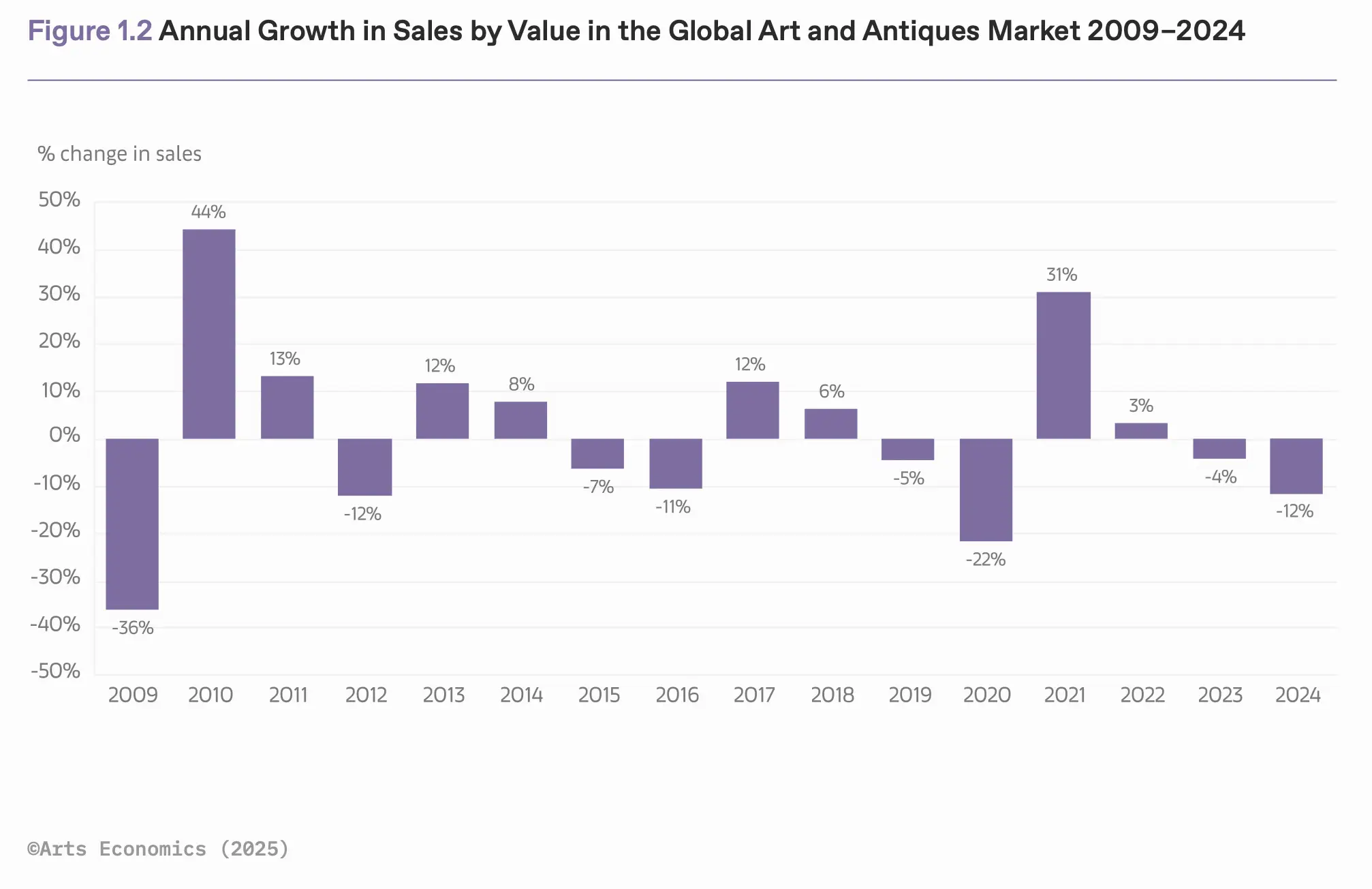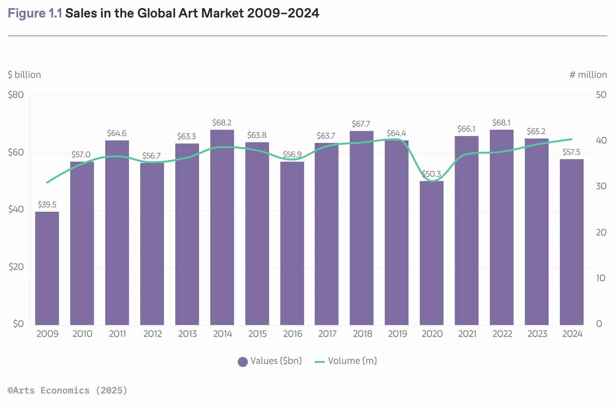 First and foremost, 2024 was indeed not a good year. A 12% drop is significant, especially considering it is a consecutive decrease after a more modest -4% in 2023. But is the art market crashing? In 2020, due to the COVID-19 pandemic, the market declined by 22% to approximately $50 billion. In the aftermath of the 2008 financial crisis and global recession, the art market tanked to just $39.5 billion—a 36% decline. When times are unsure and tough, the market responds, as collectors are more cautious and hesitant, both to buy and to sell. Considering today’s geopolitical climate, it is no surprise that dealers cited the prevailing context of political and economic volatility as their top challenge for 2024. In times of conflict, combat, and economic warfare, it was written in the stars that less money would circulate in the art market. Comparing the current 12% decrease to the aforementioned 22% and 36%, words like “crash” and “crisis” seem a bit harsh. Both in total value and in terms of the percentages, 2022 to 2024 are very comparable to the market in 2014 to 2016. In hindsight, we would never call those years an art market crash—so perhaps a more nuanced and sober look at this report is advised, rather than using it to fuel market uncertainty. Yet, despite the comforting nuance the bigger picture offers, it also reveals a more worrying trend: the market is not growing. Over the past 20 years, there has been no upward trend in the total value of the art market, whereas the markets for other luxury goods have been growing steadily—a conclusion that deserves further discussion in a different article on a different occasion.