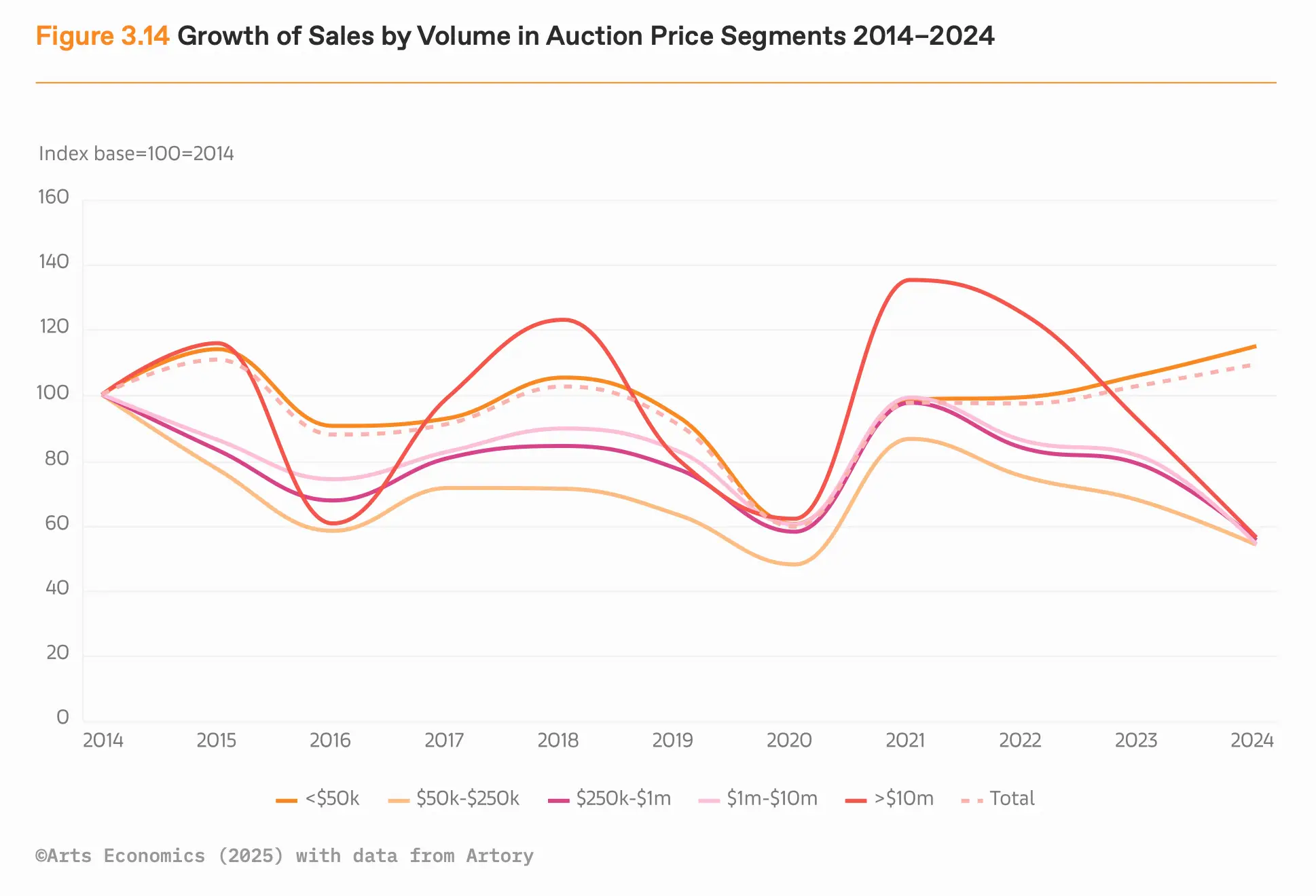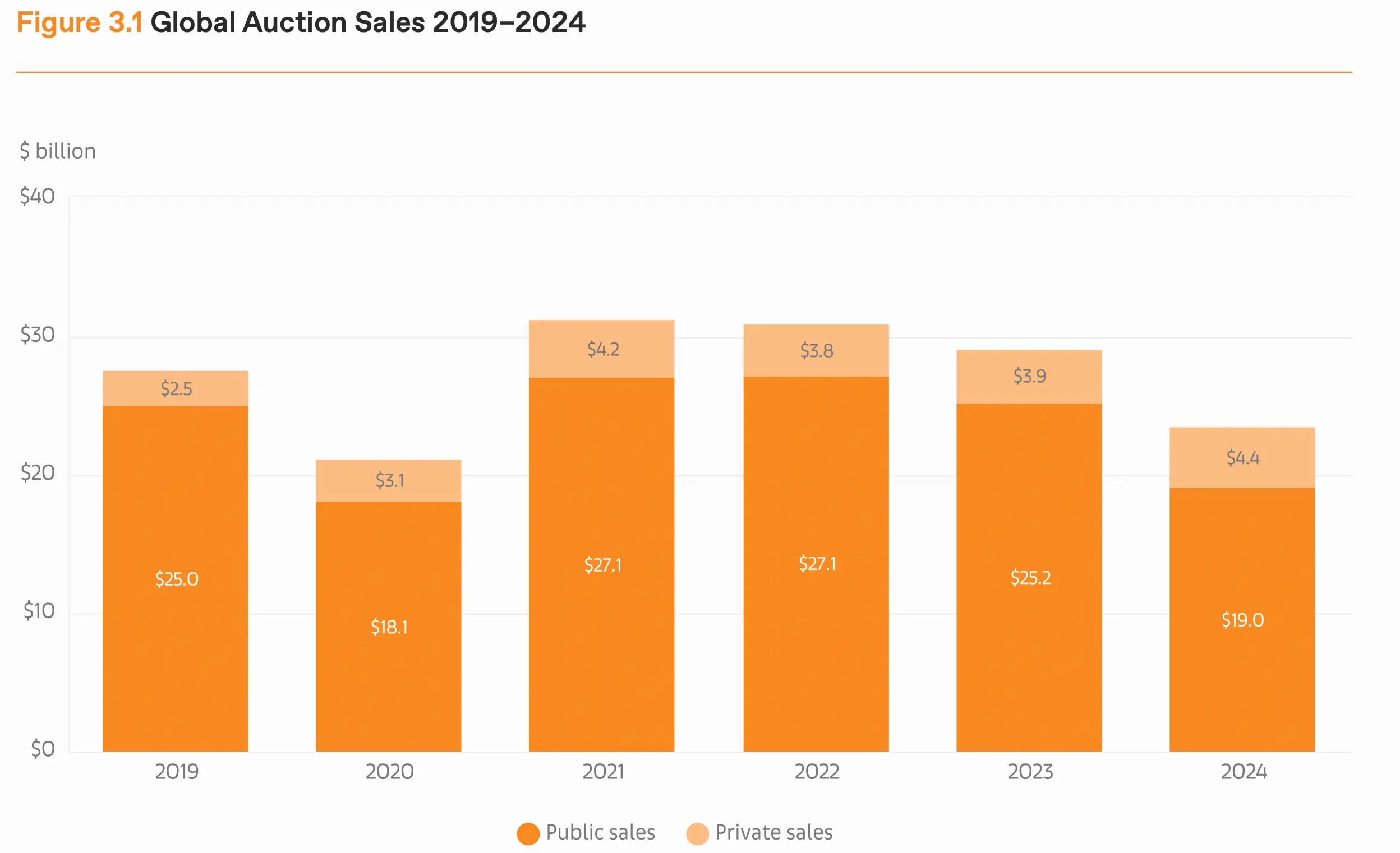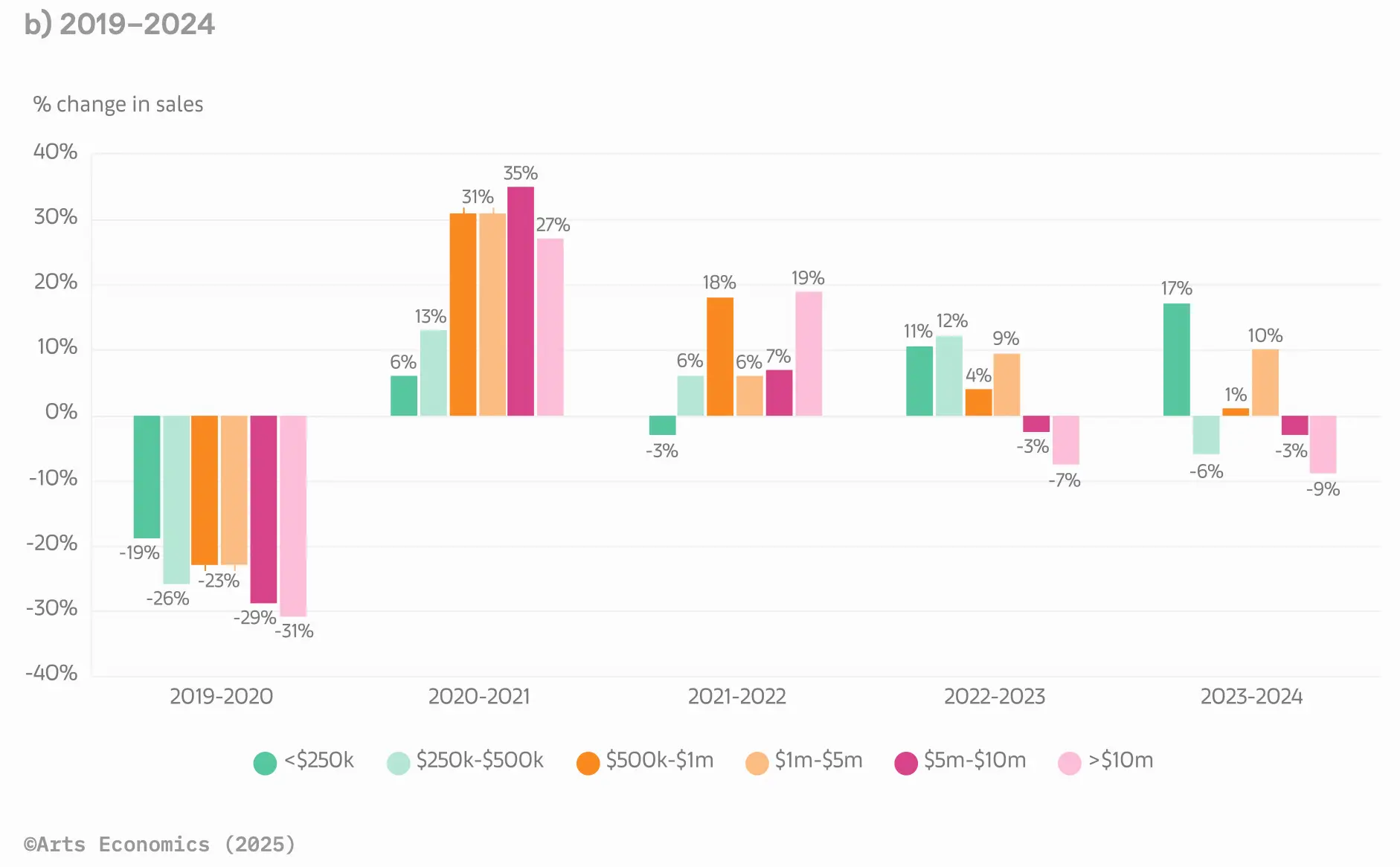 So, the market has dropped. Now let’s find out who took the most significant blows. In a nutshell, the high-end of the art market has noticed a sharp decline. Despite a 12% decrease in the total market, the number of transactions increased by 3%. This 3% growth is not the key finding here; it is growth, but it is not significant enough to conclude that more people are buying art. It especially underscores that, with approximately the same number of transactions, the value is significantly less, as the top end of the transactions has lost considerable ground to the lower end. To understand this better, we need to examine both the primary market with the art galleries, which saw a 6% decline in value, and the secondary market, the auction houses, facing a 25% decrease. Let’s start with the latter. The high-end segment plummeted, with 39% fewer sales above $10 million, following a 28% decline in 2023, resulting in a 45% decrease in value. This segment was growing strongly in 2021 and 2022, and now we see the almost cyclical rhythm of this market heading firmly in the other direction. 2024 was not the year for multi-million-dollar sales, which reinforces this negative trend as big collectors hold on to their masterpieces instead of bringing them to auction, thereby not giving the market the right pieces to recover. To conclude, sales below $5,000 saw both an increase in value and volume of 7% and 13% respectively.