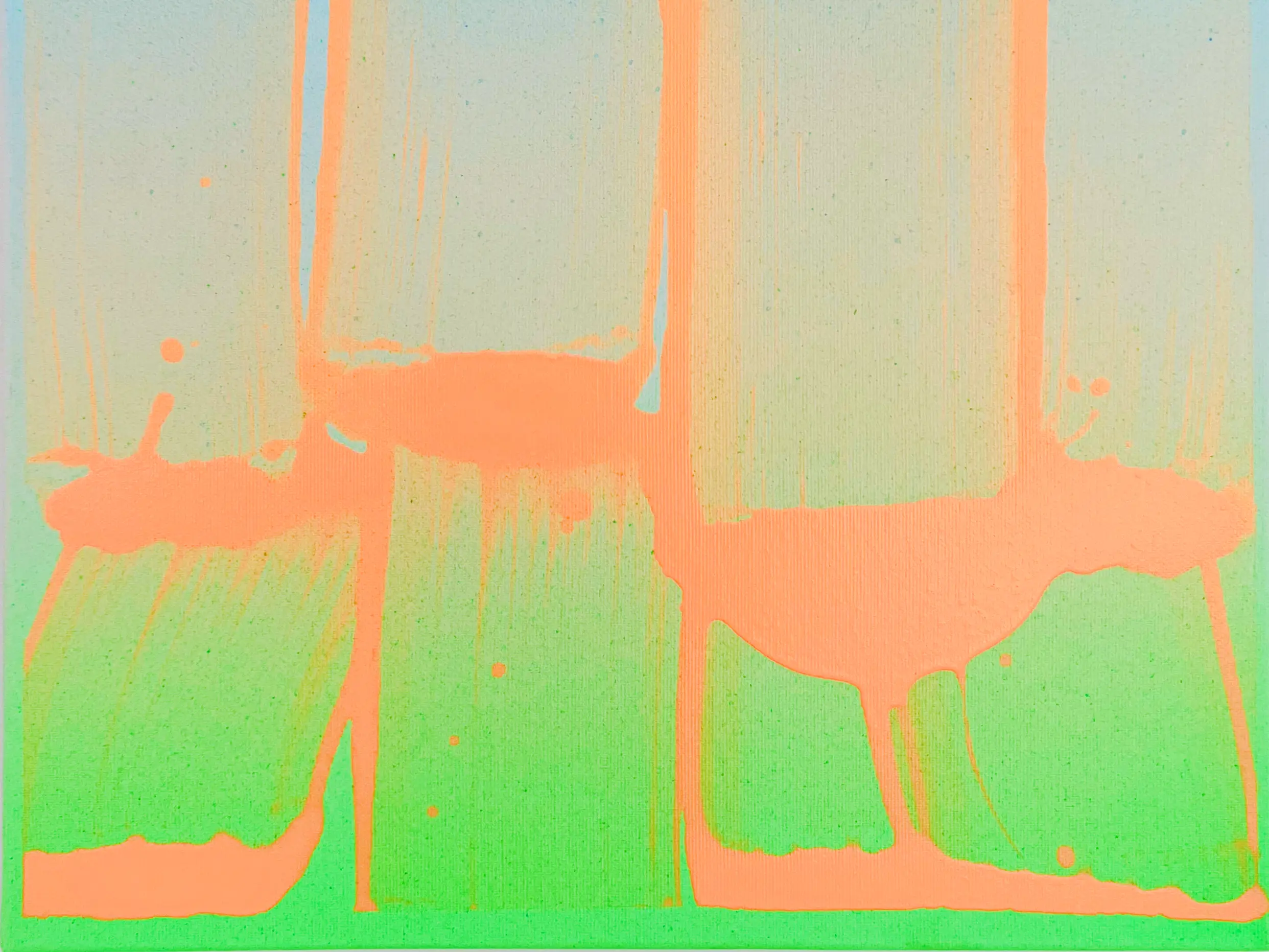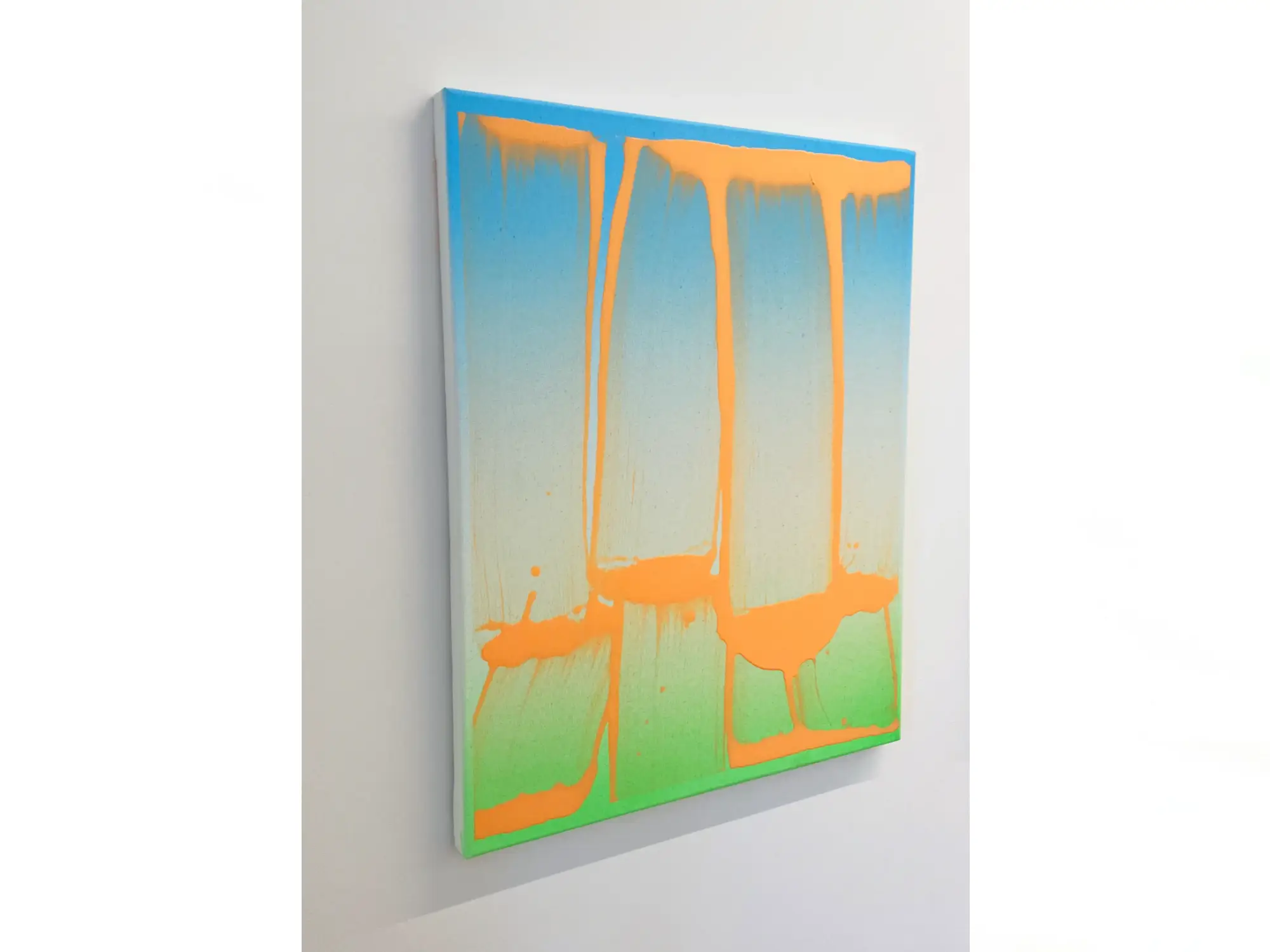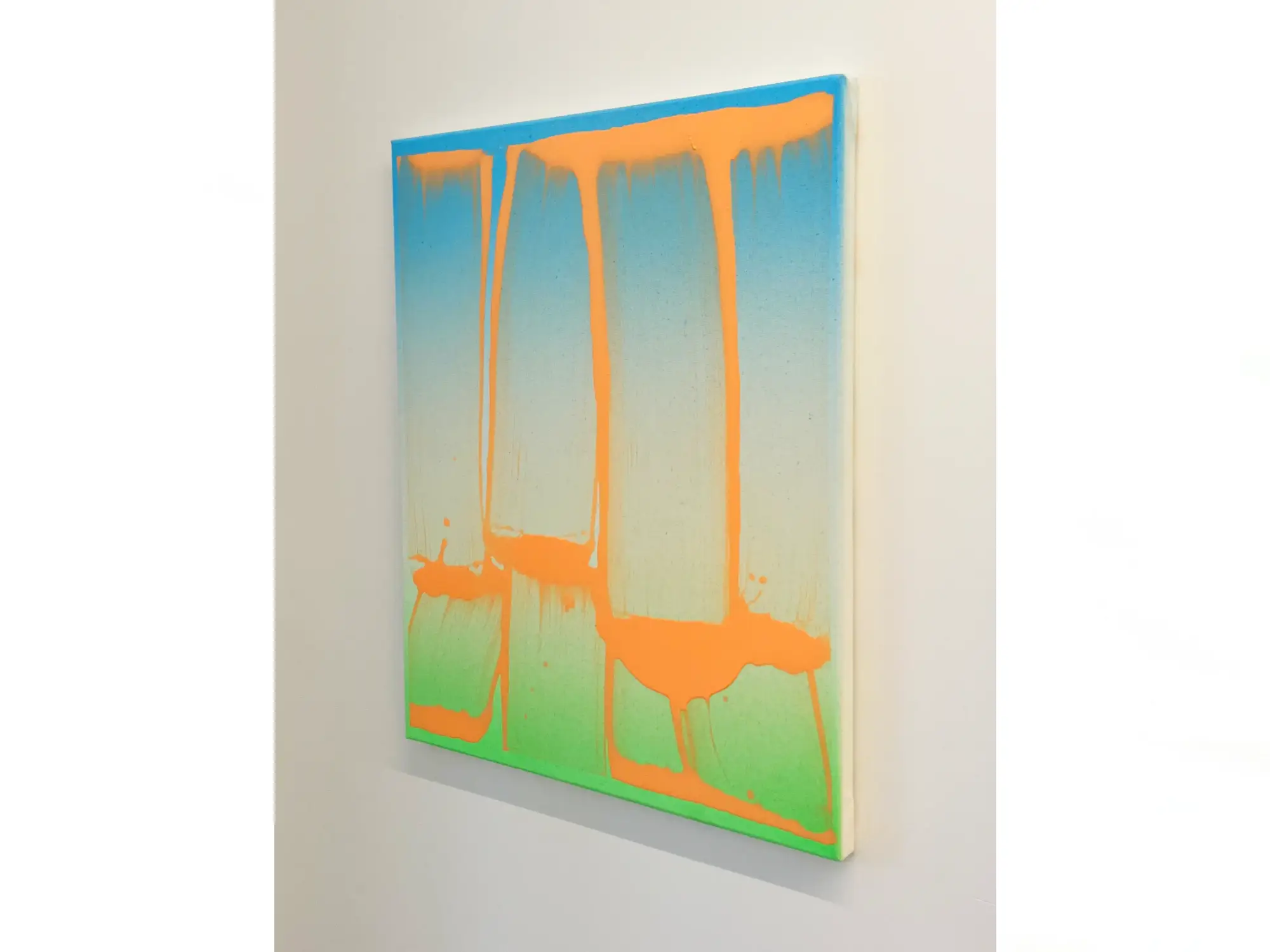 Over the past decade, his methodology has persistently employed a combination of two enthralling layers of paint. A base layer, often consisting of a flat plane or color gradient, and a gestural—one would almost say sensual—top layer. Barath plays with the grain of his underpainting versus the flatness of the picture plane. He suggests depth and movement through his linear or reflective gradients, versus the impenetrable flatness of opaque fields of color. He strolls from one side of the color wheel to the other, playing with the viscosity of his gestural motifs, interacting symbiotically with the base layer as it shines through in the transparent zones and disappears where the paint is brought together, resting thickly, as if it is in a temporal state of inactivity. The gesture moves vertically and horizontally, shifting from edge to edge, marked by pauses and peaks, producing a rhythm that recalls the human pulse—an emblem of vitality. Two-tone paintings are typically executed in quasi-complementary colors for maximum effect, as is the case with his triadic color palette when using three tones to create maximum impact, pushing the experience of pigment and radiance in painting to new heights where the painting itself almost starts to feel otherworldly, as if digital, before anchoring in reality and the analog once more through the luscious use of texture, paint splashes, and liquid movement.