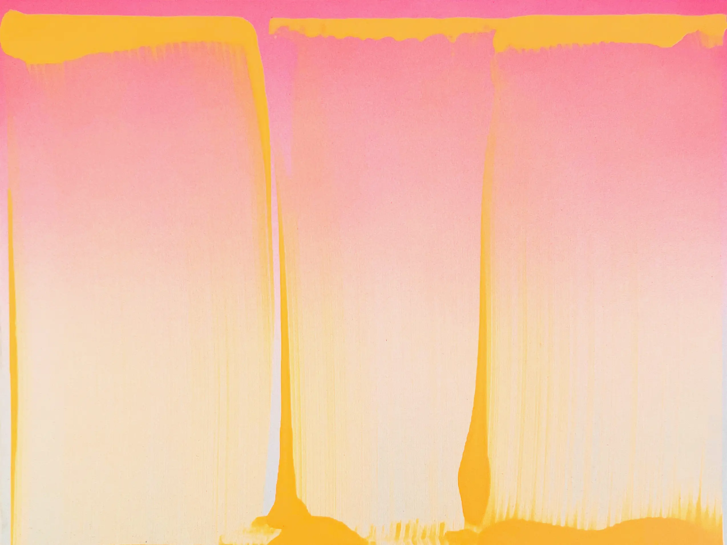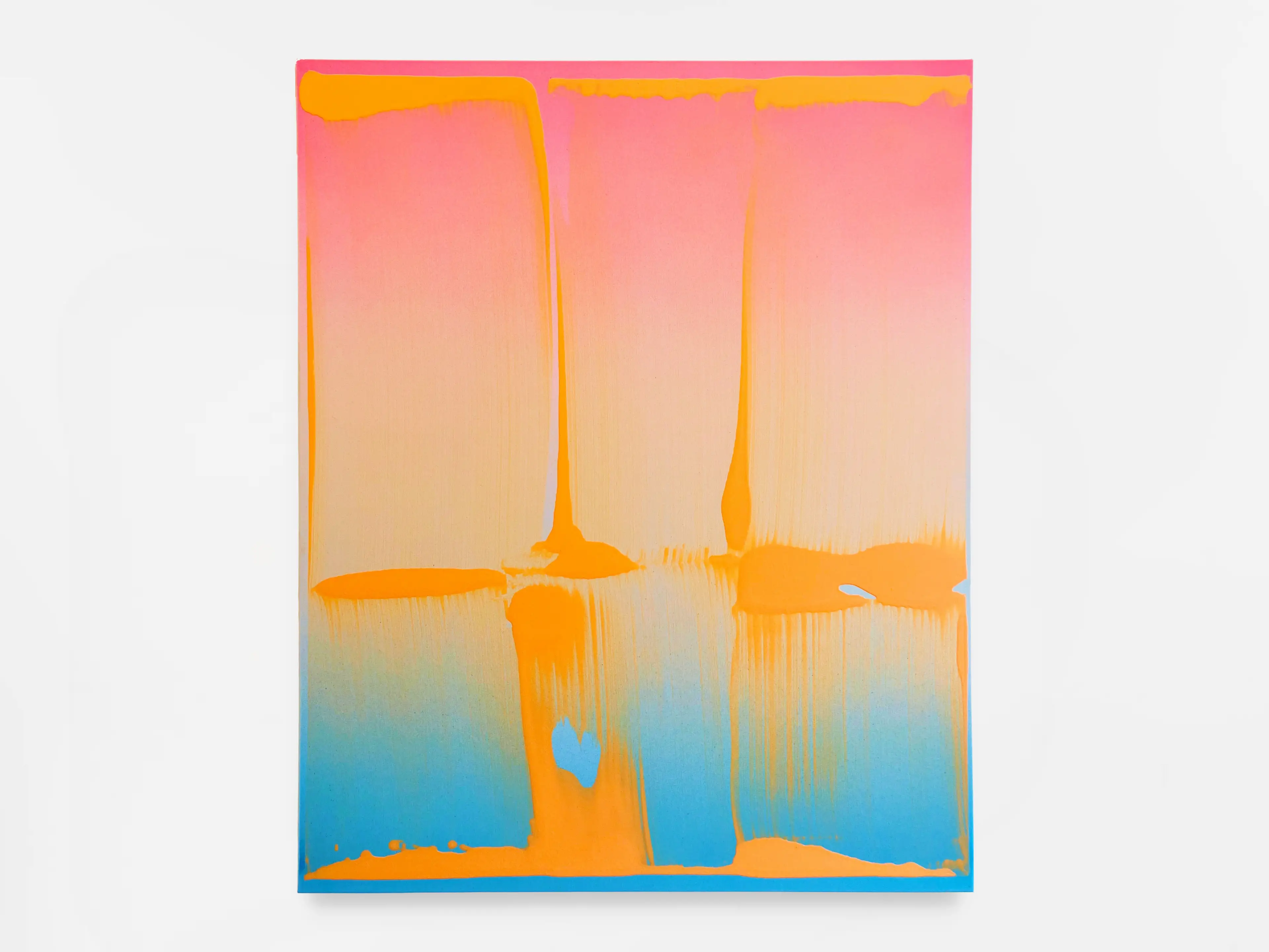 Over the past decade, his methodology has persistently employed a combination of two enthralling layers of paint. A base layer, often consisting of a flat plane or color gradient, and a gestural—one would almost say sensual—top layer. Barath plays with the grain of his underpainting versus the flatness of the picture plane. He suggests depth and movement through his linear or reflective gradients, versus the impenetrable flatness of opaque fields of color. He strolls from one side of the color wheel to the other, playing with the viscosity of his gestural motifs, interacting symbiotically with the base layer as it shines through in the transparent zones and disappears where the paint is brought together, resting thickly, as if it is in a temporal state of inactivity. The gesture moves vertically and horizontally, shifting from edge to edge, marked by pauses and peaks, producing a rhythm that recalls the human pulse—an emblem of vitality. Two-tone paintings are typically executed in quasi-complementary colors for maximum effect, as is the case with his triadic color palette when using three tones to create maximum impact, pushing the experience of pigment and radiance in painting to new heights where the painting itself almost starts to feel otherworldly, as if digital, before anchoring in reality and the analog once more through the luscious use of texture, paint splashes, and liquid movement.