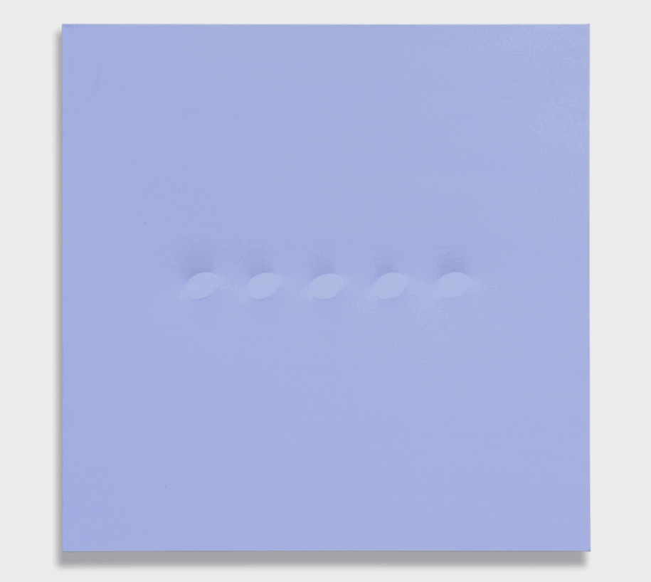 His iconic paintings are one of the earlier examples of genuine minimal painting. Flat planes of color fill the canvas, with the slashes or punctures being the only motive within his paintings.
