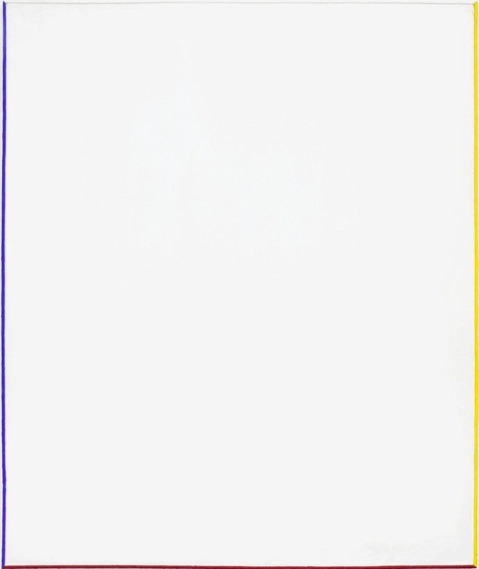 With his paintings, we encounter several of the main characteristics and motives of minimalist painting (cf. supra). He uses a rigorous and calculated approach to painting. With some work, he places thick and thin vertical lines at variable distances. In contrast, with other works, he implements no motive, experimenting with color and expansive painting, altering the shape of the canvas, or combining multiple canvases for a single painting.[7]