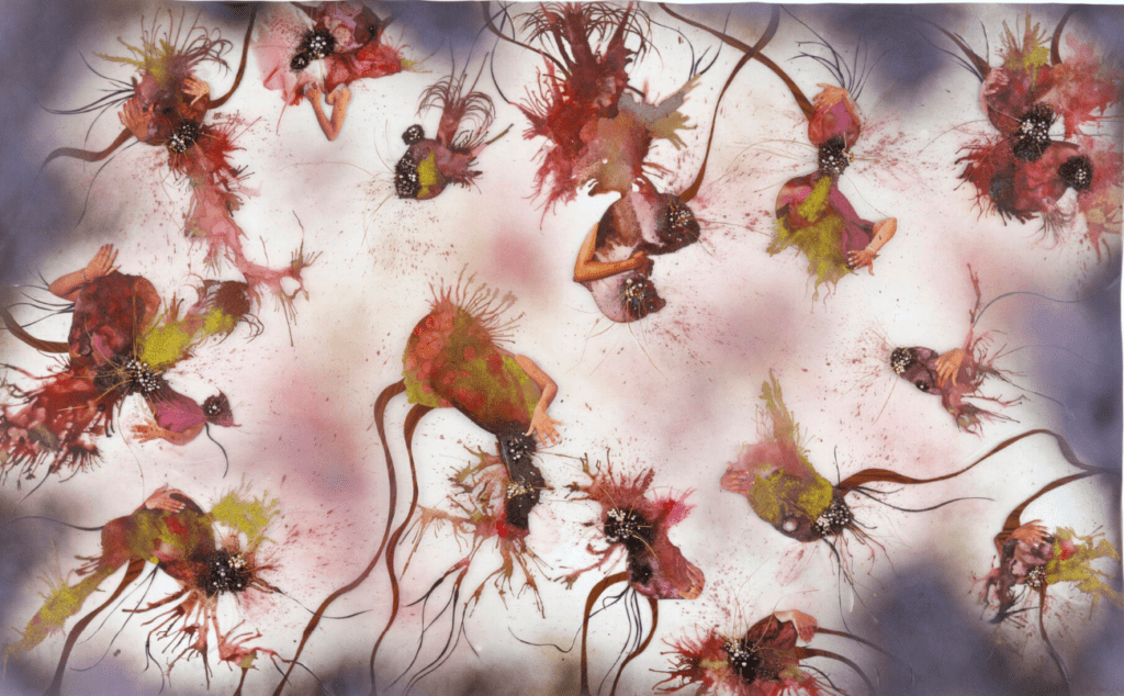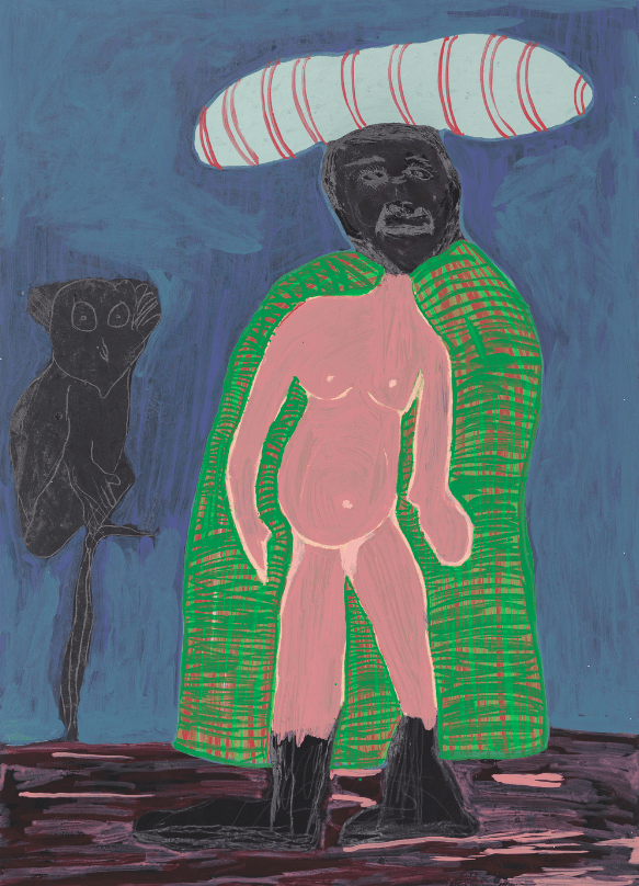 The Cameroonian artist is occupied with installation, performance, photography, and intriguing watercolor paintings. He explores the flow of people, which is regulated, similarly to we handle merchandise or resources between the West and third-world countries. His painterly practice acts as a diary of travel. Human-like shapes seem to transform into animals or abstract elements.[13]