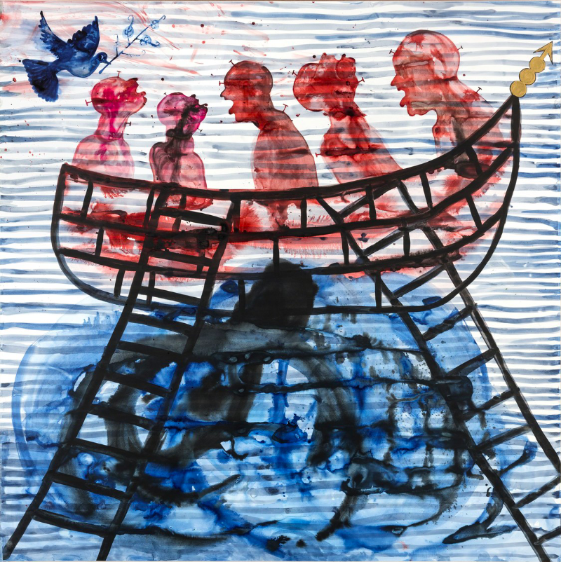 Painting is essential to his artistic practice, implementing the elements above on a two-dimensional surface. He questions the value of art, often mocking the notion of originality. He takes on racial or religious stereotypes with sharp humor, examining moral codes or political implications.[8]