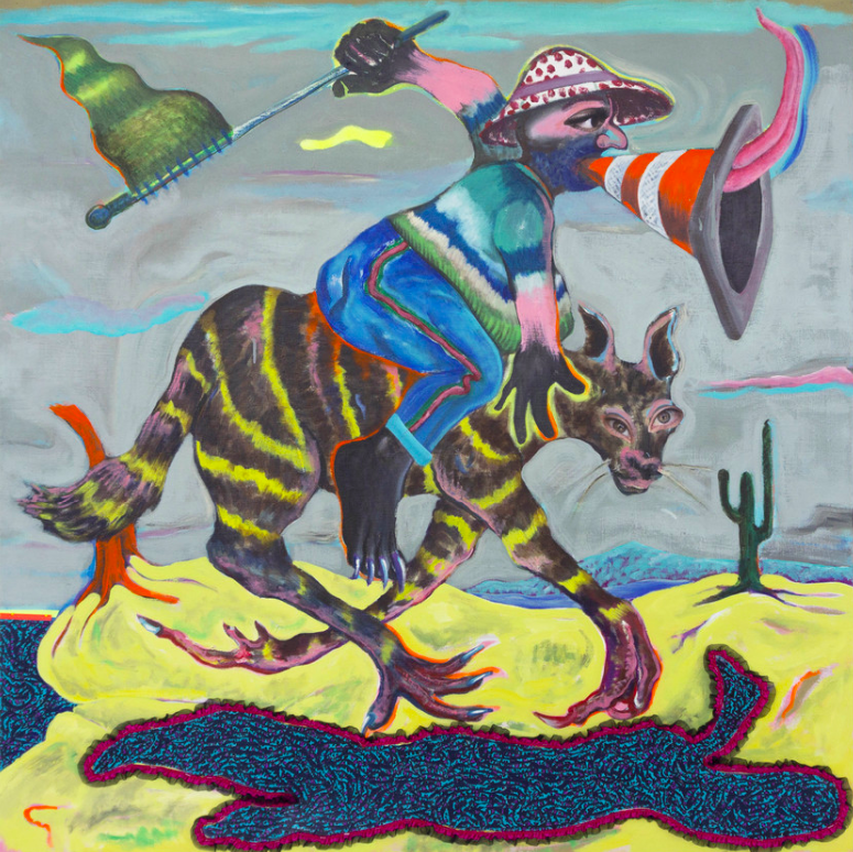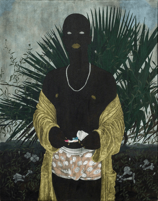 Up next, we have a true virtuoso, Michael Armitage. Born in 1984 in Nairobi, Kenya, Armitage is a contemporary painter living and working between London, the United Kingdom, and his hometown. He is best known for his figuratively rendered oil paintings, painted on a traditional bark cloth from Uganda called Lubugo.