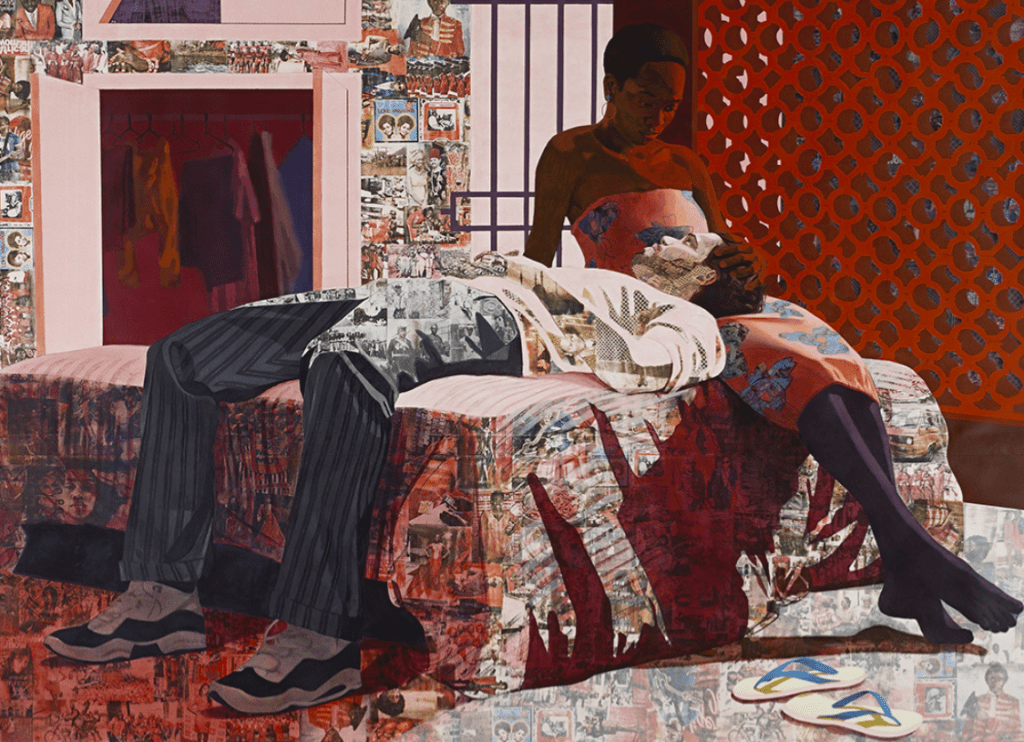 Njideka Akunyili Crosby draws inspiration from art historical, political and personal references. Her figuratively rendered paintings conjure the complexity of our contemporary existence and experience. Interiors, everyday life, and social gatherings are key themes throughout her impressive body of work. However, the artist creates a series of visual interventions by implementing a vibrant effect of patterns and photo collages derived from Nigerian culture, popular culture, or collective memory.[9]