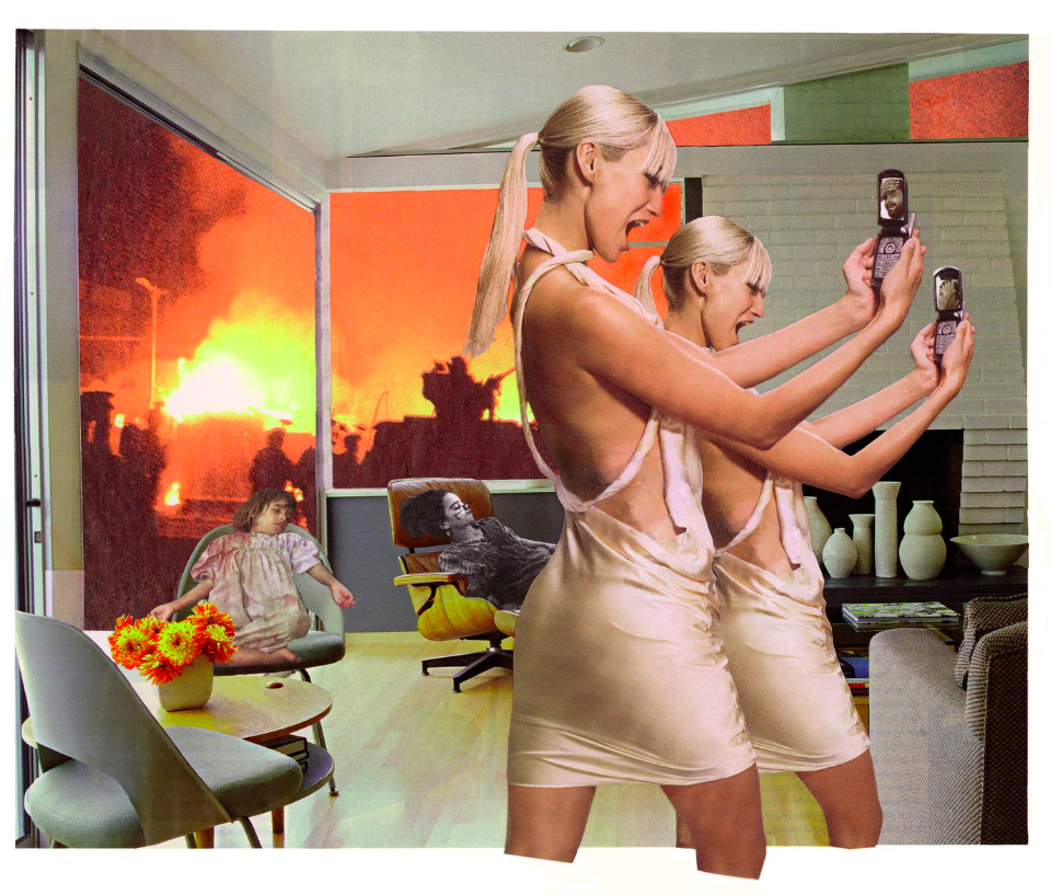 She fights social injustice, simultaneously tackling issues in politics on war and politics on identity. She captures the contrast between the horrors of war and women’s domestic lives in a single picture. A domestic scene takes place in an often stereotypical manner in which the role of women in society is the central subject. Simultaneously, we encounter cruel war scenes instead of seeing a beautiful garden or urban environment through the windows of those American interiors.[7]