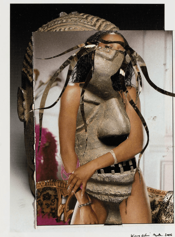She creates and depicts distorted female figures and forms; think of her mixed media collage on paper from 2006, titled Mask. Wangechi Mutu uses her art to fight against inequality and the lingering effects of globalization and consumerism.[13]