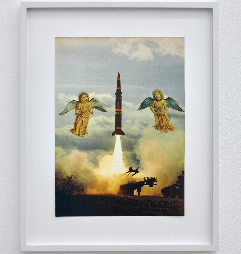 With Ferrari’s collages, the artist often incorporates language or calligraphy, examining power dynamics and social hierarchies, often related to religion, the state, or both. For instance, with Untitled from 1987, Ferrari uses the pictorial tradition of the Ascension of the Virgin Mary, depicting two angels along the sides of a missile taking off into the sky, to critique militarism and conservative entities who remain silent.[19]