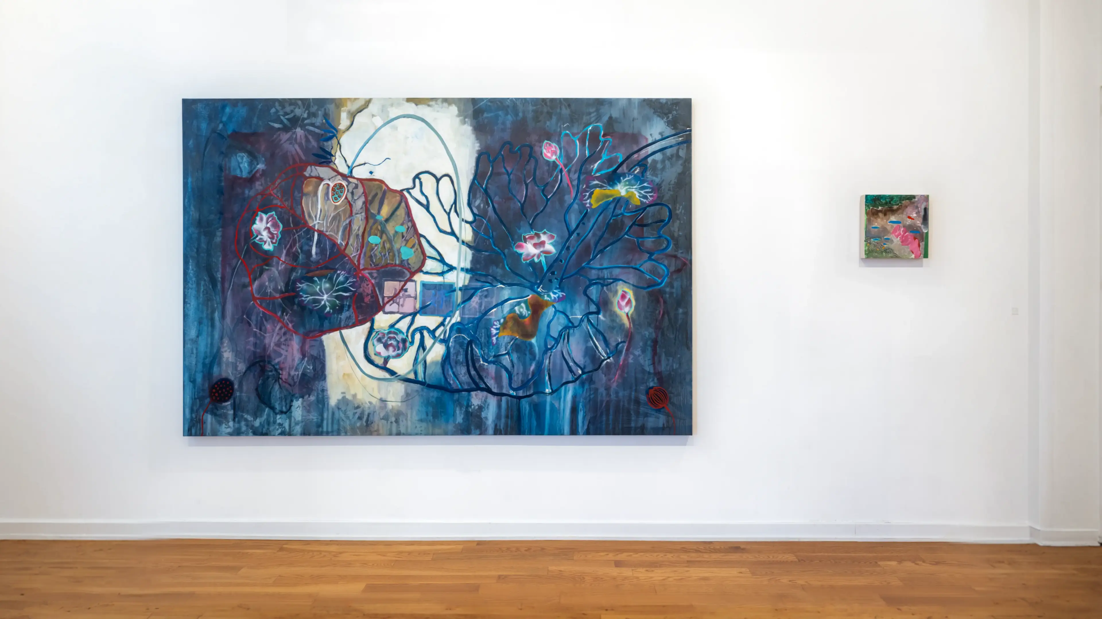 From koi fish in water to threatening red seas, and from still lifes to everyday elements. Rather than depicting the subjects straightforwardly or traditionally, the works construct an internal cosmos in which these elements circulate and recombine. Surfaces appear charged, cracked open, and in flux, as if capturing a moment before differentiation settles. Within these fields, images of bamboo and lotus appear as intermittent shadows. They are not central emblems so much as echoes: delicate, recurring silhouettes that move through zones of fluorescent color and shifting marks. Their presence signals an attachment to home and a warmth associated with origin. Yet, the artist frames them as unstable and rugged, holding them in place—memories that flicker and do not resolve into a single, definitive sign.